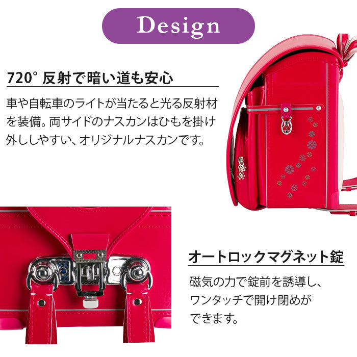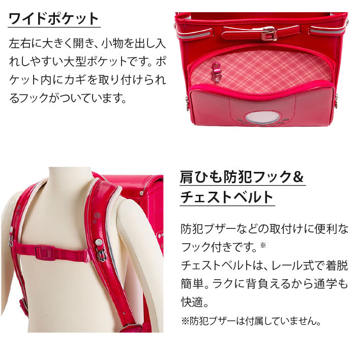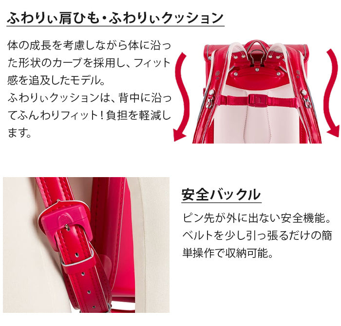 | 特徴 | 日本製 6年間品質保証付き A4フラットファイル対応 レール式チェストベルト付き のび~るポケット ふわりぃ肩ひも 安全バックル ダブルナスカン付き ラクラクナスカン ワイドポケット ふわりぃ背カン スーパーブレスター 9穴肩ひも 720°反射材 ポケット内フック付き オートロックマグネット錠 |