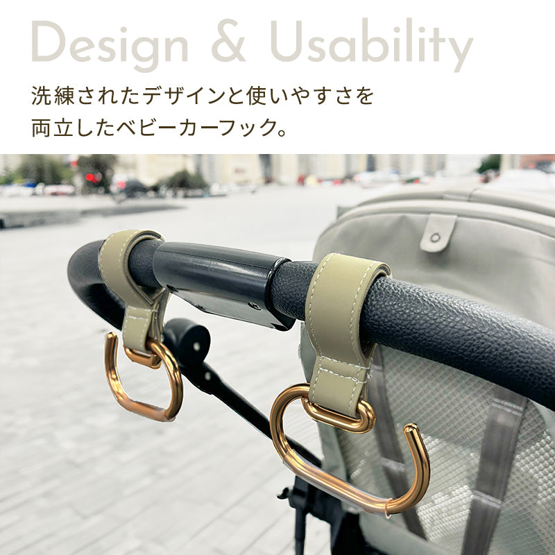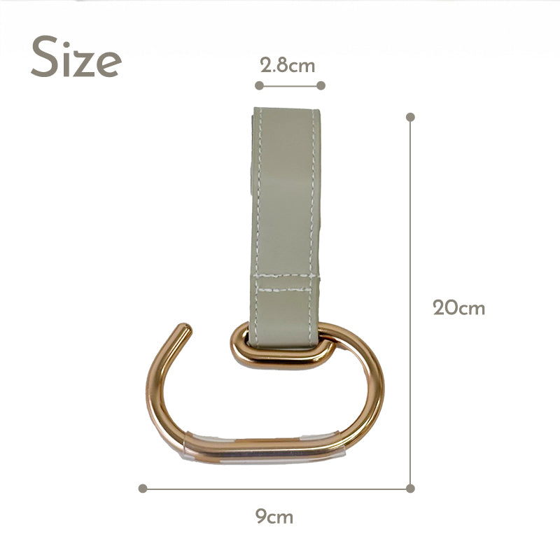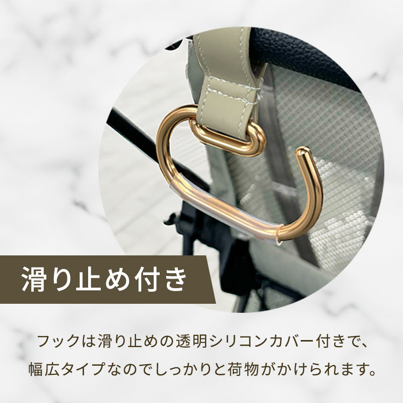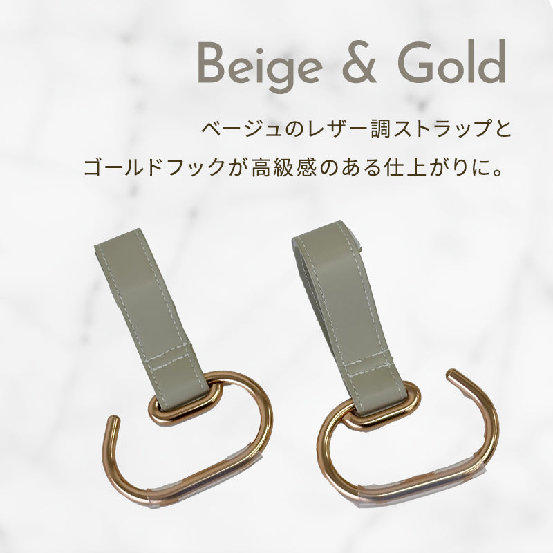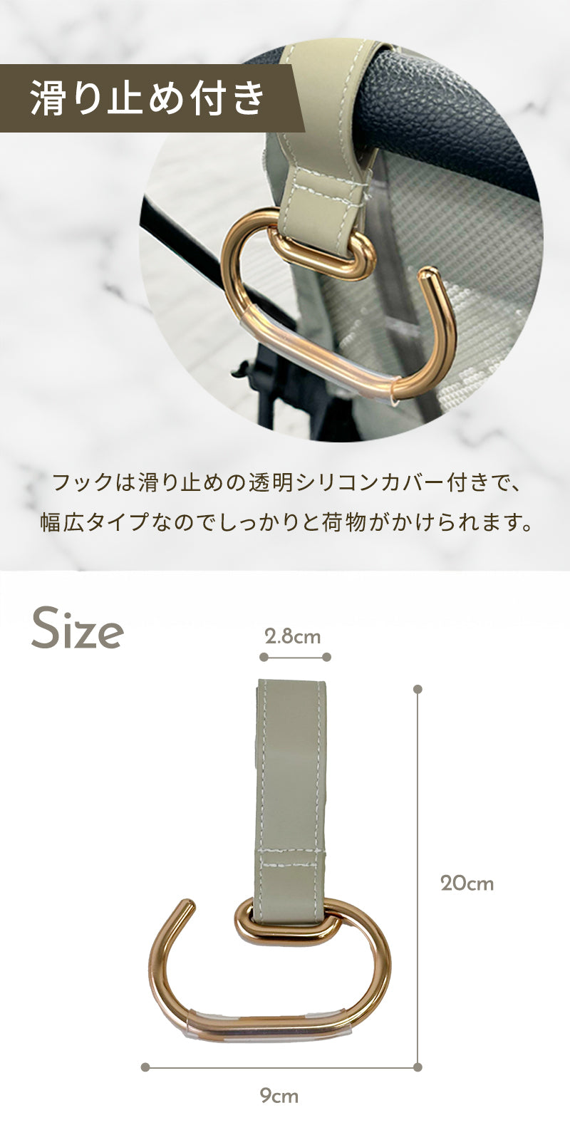 【お子様とのおでかけをサポート!】 洗練されたデザインと使いやすさを両立したベビーカーフック。 ベージュのレザー調ストラップに金ピンクベゴールドの高級感のあるフック。 フックは滑り止めの透明シリコンカバー付きで、幅広タイプなのでしっかりと荷物がかけられます。 |