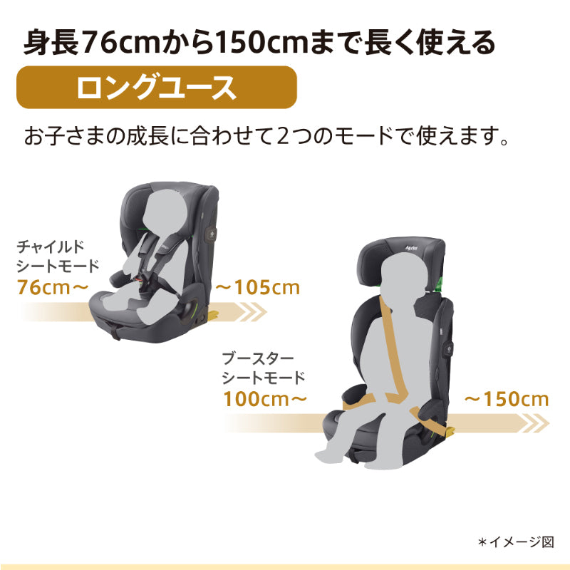 ・身長:チャイルドシートモード※ 身長:76cmかつ月齢15カ月以上~105cm ※チャイルドシートモードでは体重22kgを超えるお子さまには使用できません ブースターシートモード:身長100cm~150cm |