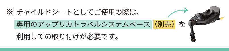 チャイルドシートとしてご使用の際は、専用のアップリカトラベルシステムベース(別売)を利用しての取り付けが必要です。 |