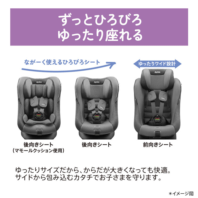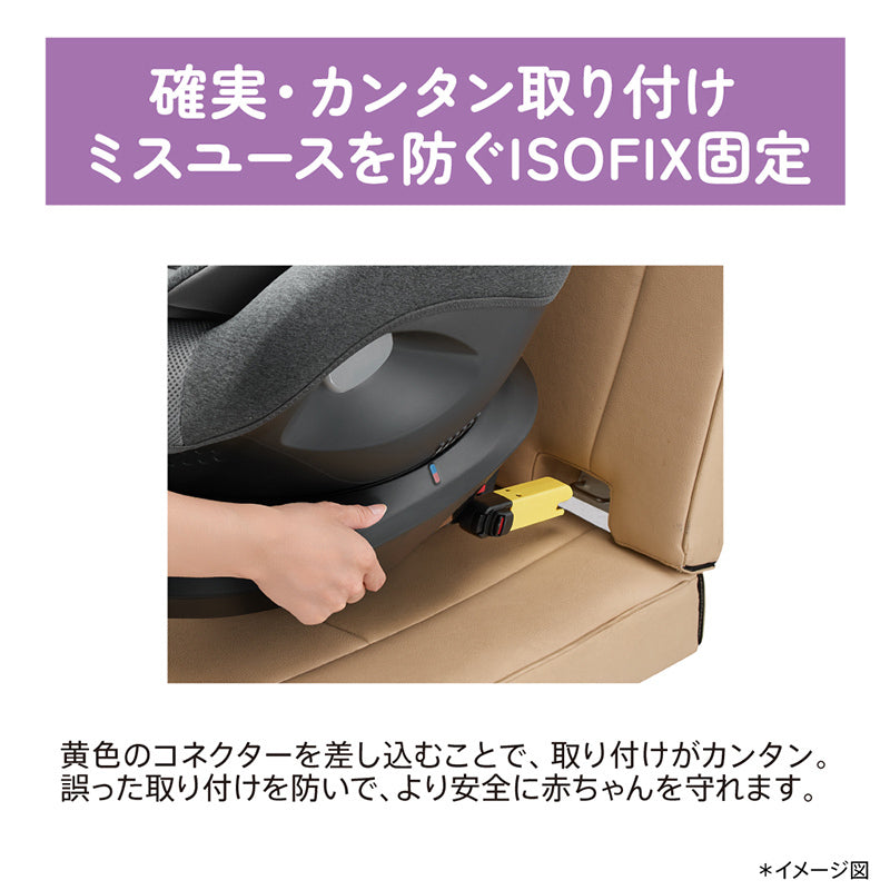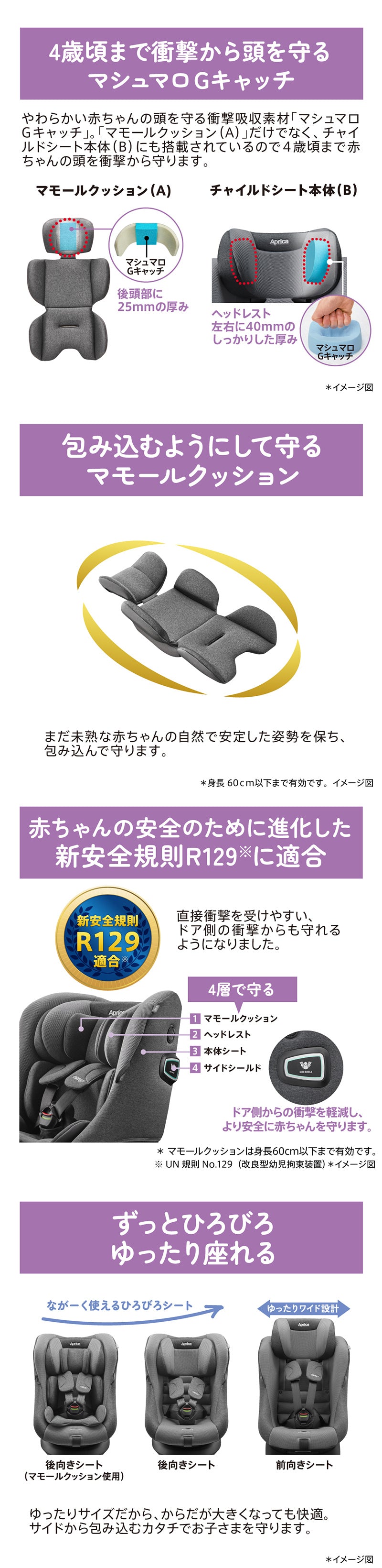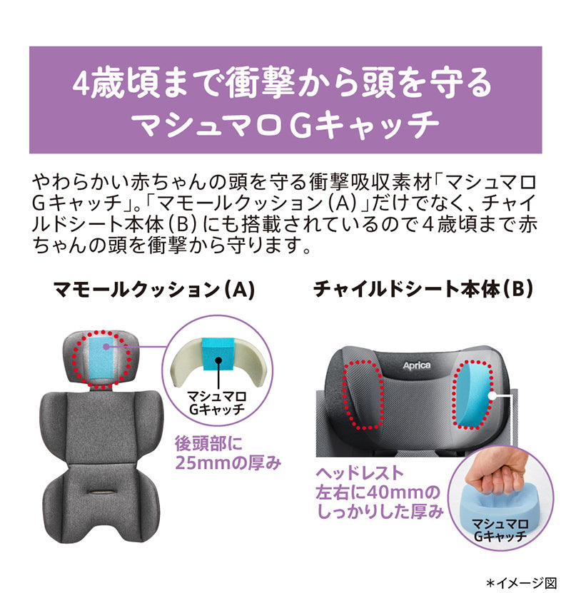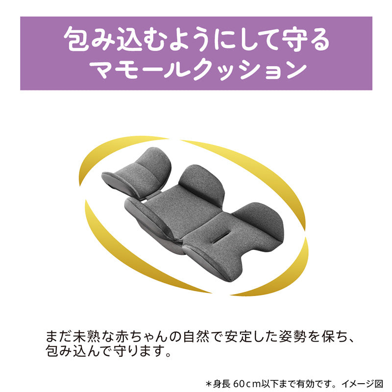「マモールクッション」だけでなく、チャイルドシート本体にも搭載されているので4歳頃まで赤ちゃんの頭を衝撃から守ります。