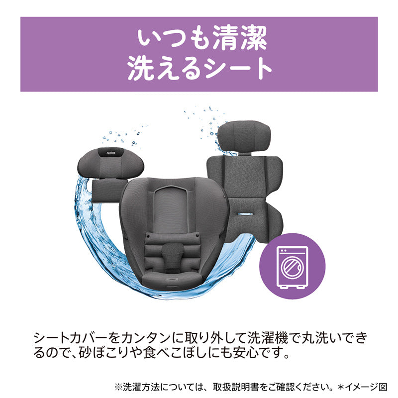 シートカバーをカンタンに取り外して洗濯機で丸洗いできるので、砂ぼこりや食べこぼしにも安心です。