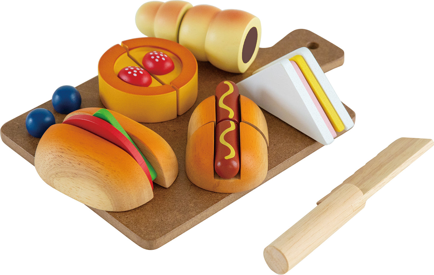 ふっくら美味しそうな色とりどりの焼きたてパン5種類とおしゃれなカッティングボード、パンナイフが揃ったおままごとセットです。