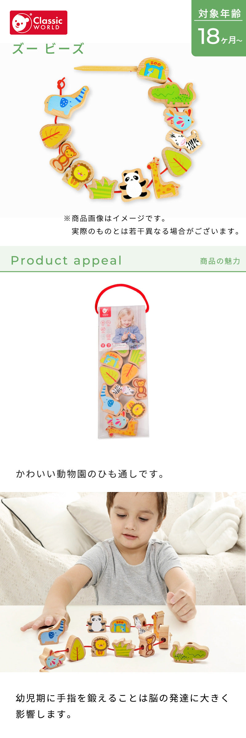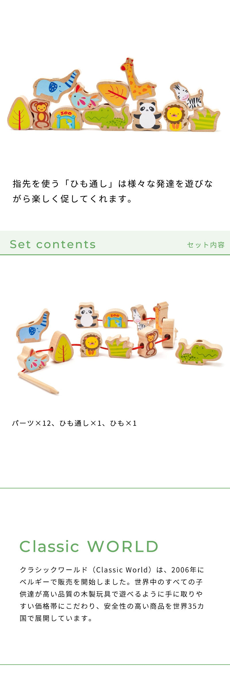 クラシックワールド(Classic World)は、2006年にベルギーで販売を開始しました。 世界中のすべての子供達が高い品質の木製玩具で遊べるように手に取りやすい価格帯にこだわり、安全性の高い商品を世界35カ国で展開しています。 幼児期に手指を鍛えることは脳の発達に大きく影響します。指先を使う「ひも通し」は様々な発達を遊びながら楽しく促してくれます。 |