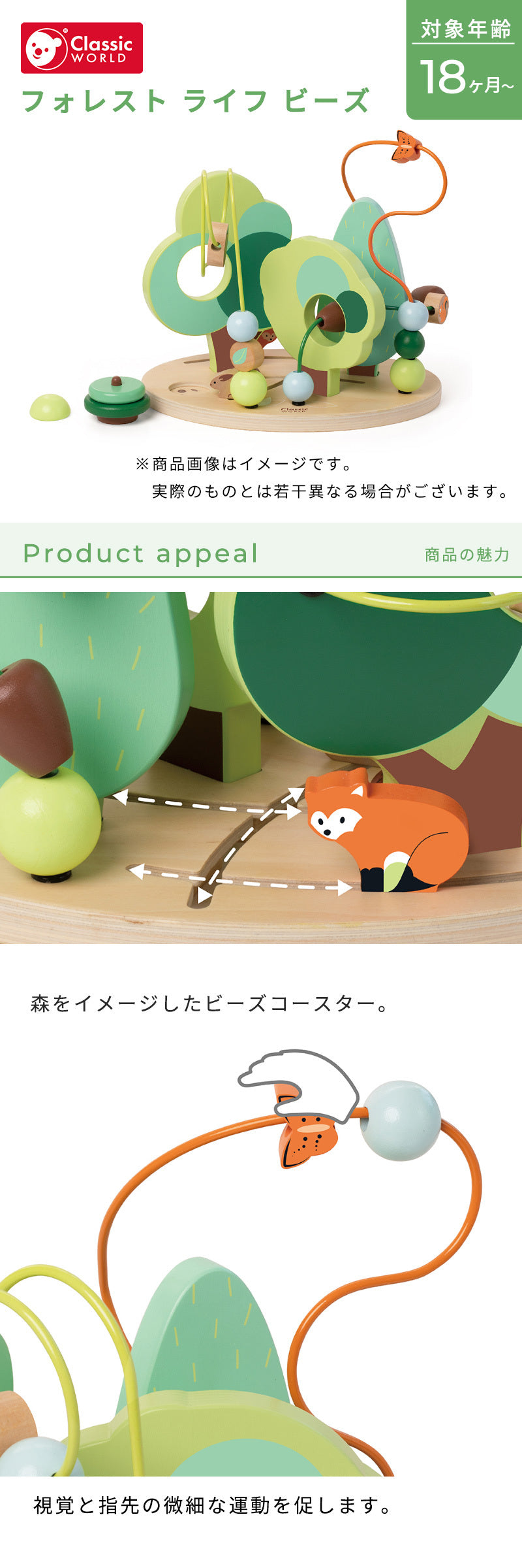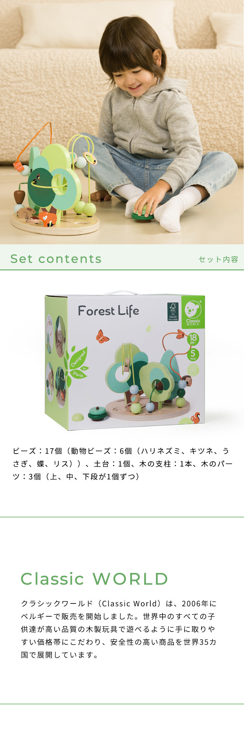 クラシックワールド(Classic World)は、2006年にベルギーで販売を開始しました。 世界中のすべての子供達が高い品質の木製玩具で遊べるように手に取りやすい価格帯にこだわり、安全性の高い商品を世界35カ国で展開しています。 森をイメージしたビーズコースター。 |