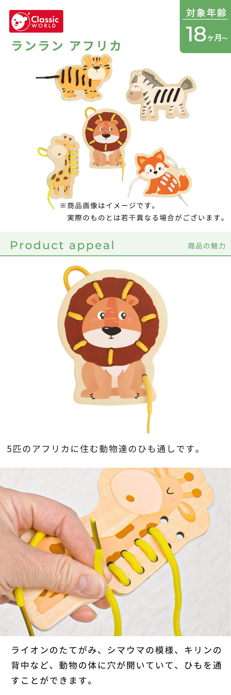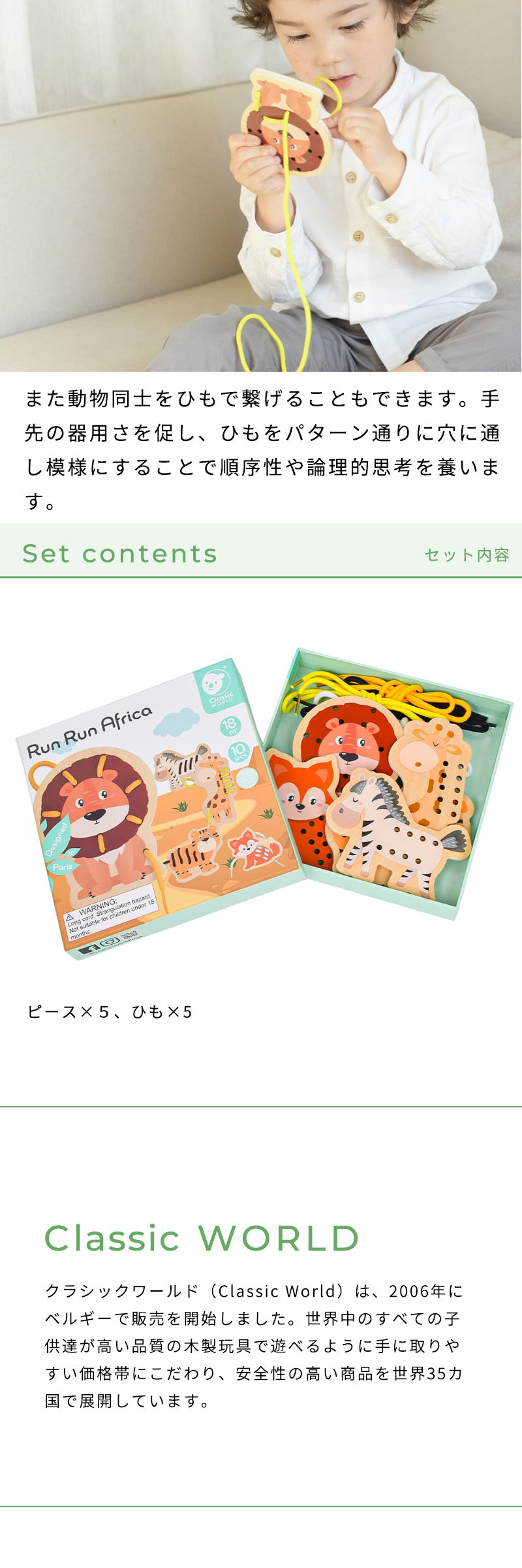 クラシックワールド(Classic World)は、2006年にベルギーで販売を開始しました。 世界中のすべての子供達が高い品質の木製玩具で遊べるように手に取りやすい価格帯にこだわり、安全性の高い商品を世界35カ国で展開しています。 5匹のアフリカに住む動物達のひも通しです。ライオンのたてがみ、シマウマの模様、キリンの背中など、動物の体に穴が開いていて、ひもを通すことができます。また動物同士をひもで繋げることもできます。手先の器用さを促し、ひもをパターン通りに穴に通し模様にすることで順序性や論理的思考を養います。 |