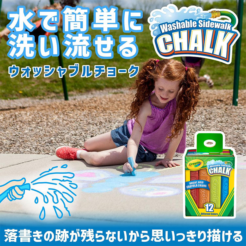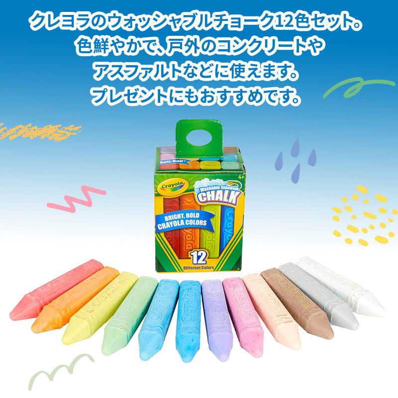 クレヨラのウォッシャブルチョーク12色セット。 色鮮やかで、戸外のコンクリートやアスファルトなどに使えます。 チョークは転がりにくい形になっていて、先端は細くなっているので滑らかに線を描くことができます。 ウォッシャブルなので、落書きしたあとは水で洗い流すことができ、落書きの跡が残らないので安心。 のびのび自由にお絵かきをさせてあげられるので、子どもたちの感性をやさしく刺激し、個性あふれる表現力と想像力を育みます。 持ち運びに便利な取っ手付きボックス入り。 お絵かきが大好きな、男の子や女の子へのプレゼントにもおすすめです。 |