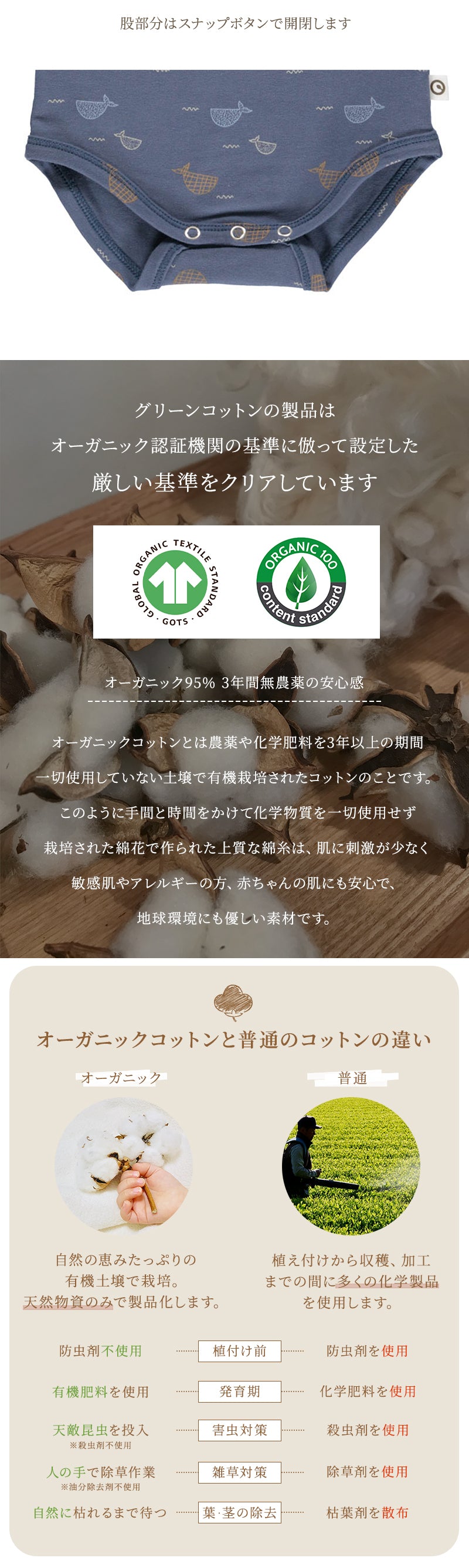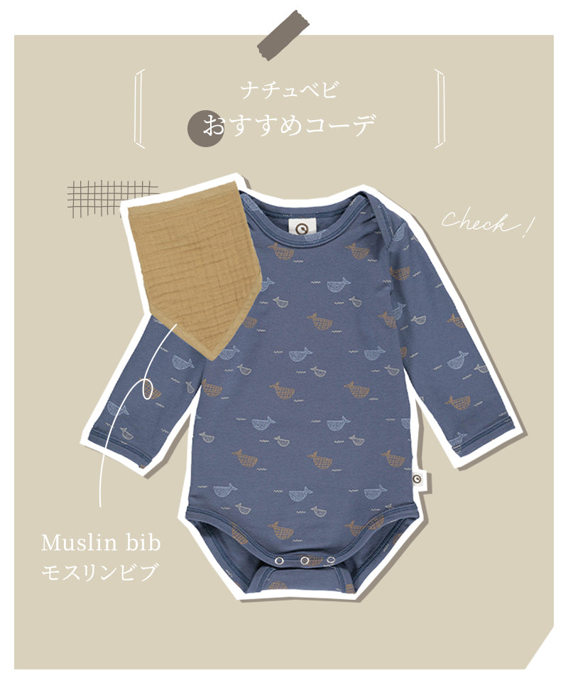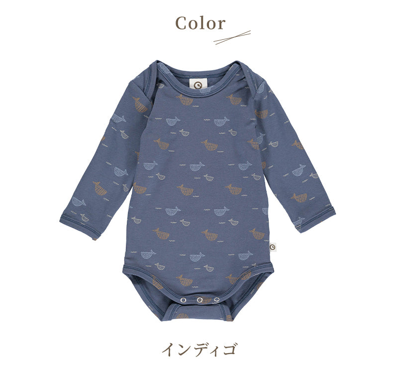 グリーンコットン Musli オーガニックコットン クジラ 長袖 ロンパース インディゴ WHALE body Indego 68~80cm