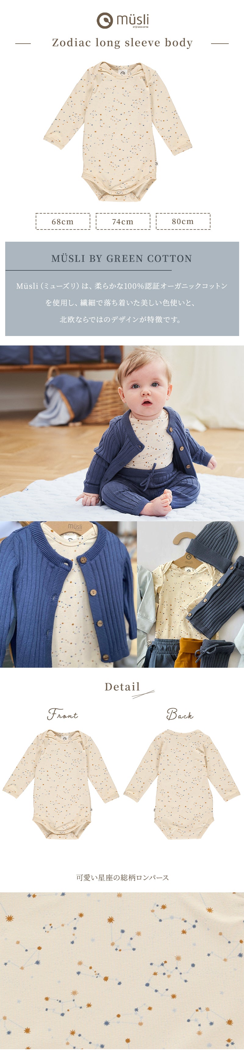 グリーンコットン Musli オーガニックコットン 星座 長袖 ロンパース ZODIAC body 68~80cm