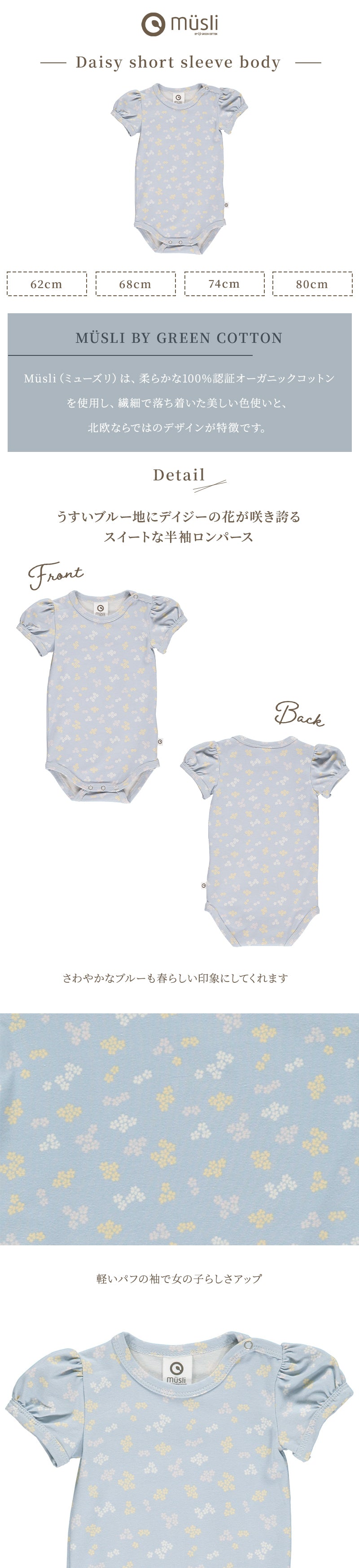 グリーンコットン Musli オーガニックコットン 花柄 半袖 ロンパース ブリージー DAISY body Breezy 62~80cm