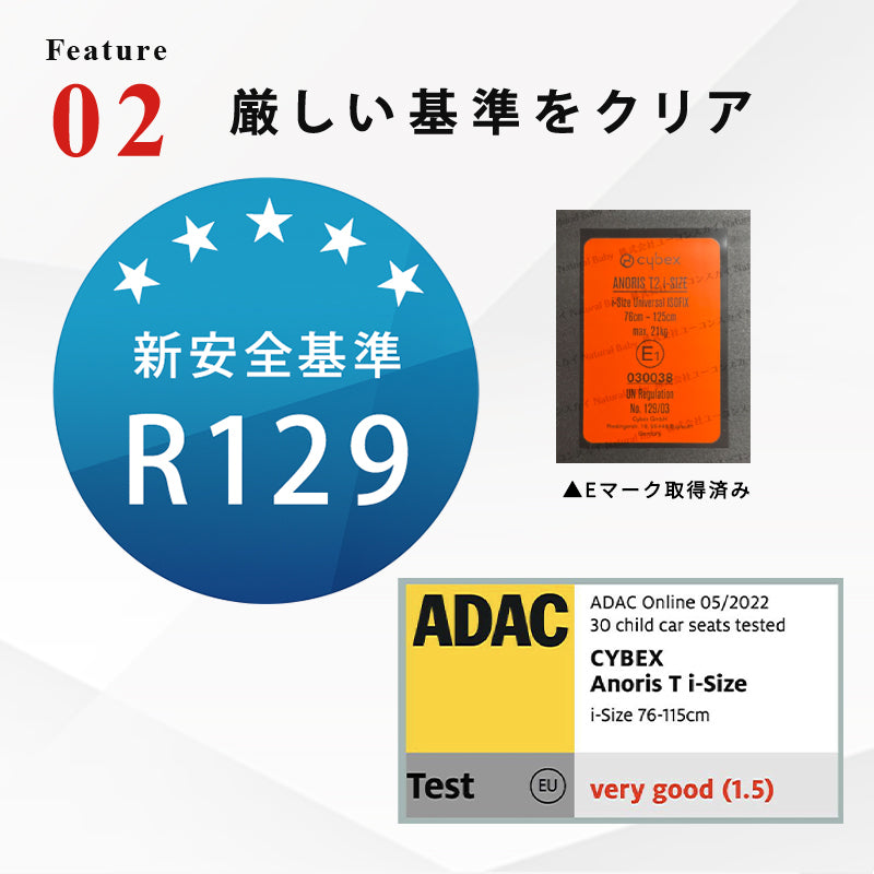 UN R129/03(i-Size) 最新の安全規格R129適合です。R129は身長基準となります |