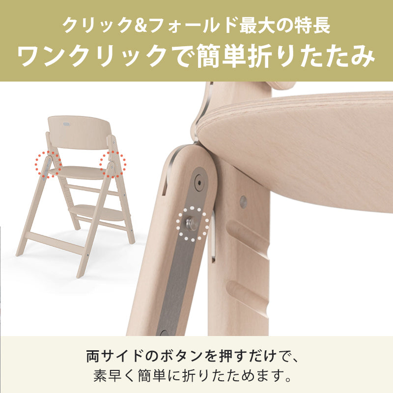 折りたためるハイチェア「クリック&フォールド」 モダンな美しさと、洗練されたデザイン サスティナブルな素材のビーチウッドを使用した、匠の技が生み出すアイコニックなデザインのハイチェア。 2つのボタンを押して、素早く簡単に折りたためるので、気軽に収納でき場所をとりません。 成長に合わせて細かく調節可能で、3歳頃から大人まで長くお使いいただけます。 |