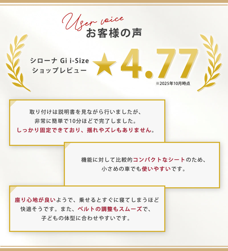 ・ご購入の前に適合車種をお確かめください。シローナSの欄をご確認ください。 ・ISOFIXの固定具がある車両、またはi-Size認定車の車両にのみ設置できます。※車のシートベルトでの取付はできません。 ・万が一事故にあった場合は、そのままシートを継続して使用しないでください。 |