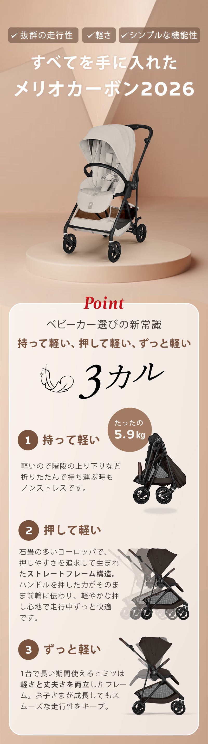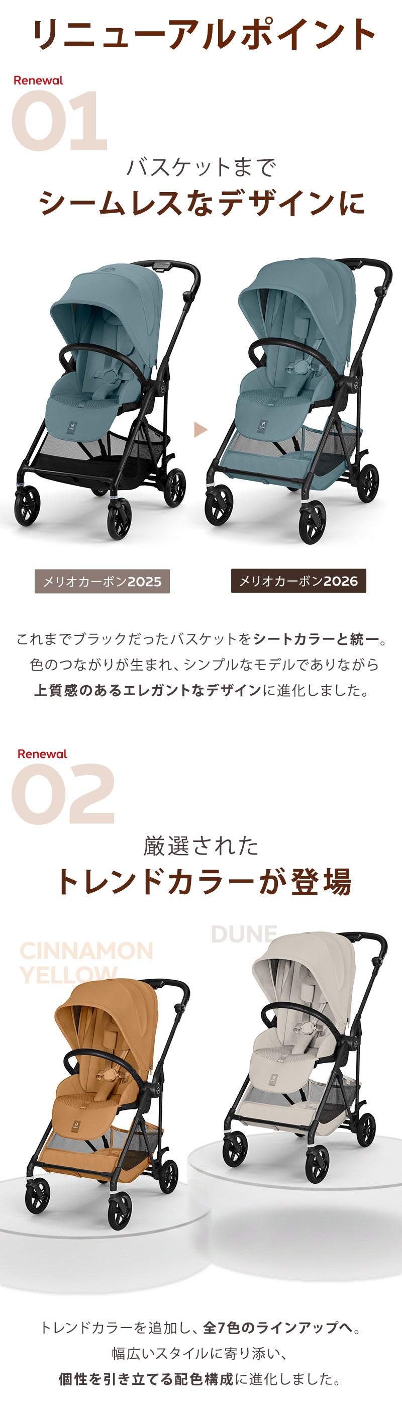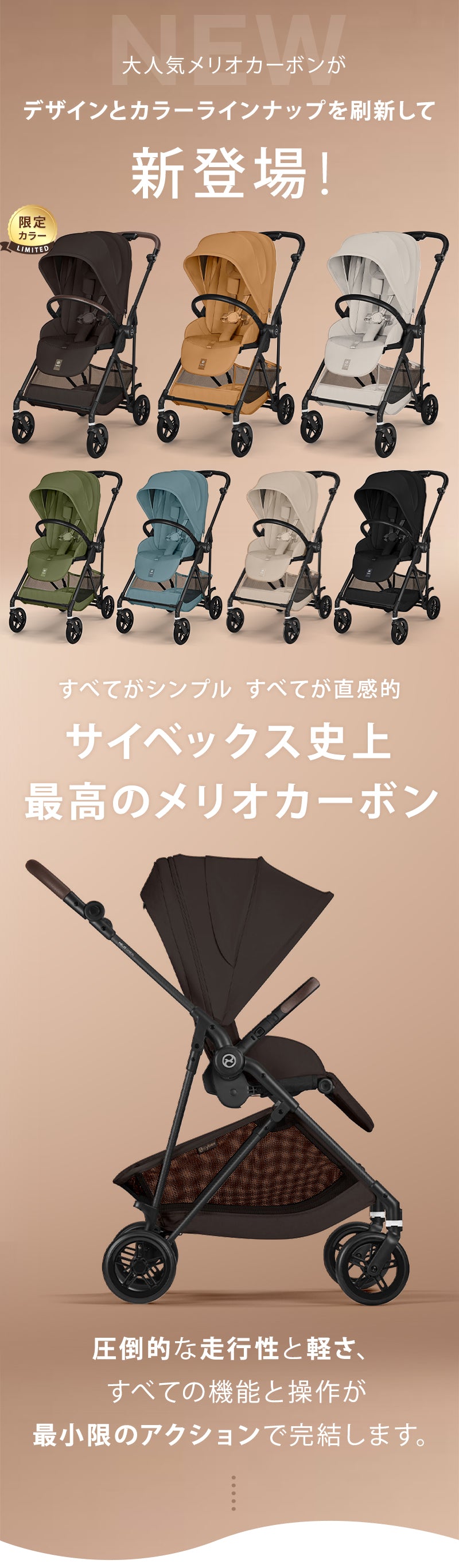 | 【メリオカーボン2026年モデル】 デザインとカラーラインナップを刷新して登場! 圧倒的な走行性、軽さ、そしてすべての機能の操作がわずかなアクションで完結します。 お子さまを抱っこしながらできる「片手開閉」、瞬時にハーネス調節可能な「ワンプルハーネス」、 ワンアクションで両後輪が操作できる「リンクブレーキ」、片手で調節可能な「リクライニングシート」など、 直感的でシンプルな操作で、だれでもすぐにメリオカーボンの機能を余すところなく使いこなすことができます。 そして使うたびに”簡単さ”を実感できるでしょう。 『2025年モデルから2026年モデルへのリニューアルポイント』 1.ショッピングバスケットのデザイン統一 2026年モデルでは、これまでブラックだったバスケットをシートカラーと統一しました。 色のつながりが生まれ、シンプルなモデルでありながら上質感のあるエレガントなデザインに進化しました。 2.カラーバリエーションの刷新 新色ニュアンスベージュ「 DUNE(デューン) 」と ゴールデン・キャメルブラウン「 CINNAMON YELLOW(シナモンイエロー) 」のトレンドカラーを追加し、全7色のラインナップへ。 幅広いスタイルに寄り添い、個性を引き立てる配色構成に進化しました。 【MELIO CARBON(メリオカーボン)とは?】 持って軽い「持ち運びの軽さ」・押して軽い「押し心地の軽さ」・ずっと軽い「生後1ヵ月から、大きくなってもずっと変わらず感じ続けられる、走行性の軽さ」。 この3つの軽さ「3カル」をかなえたヨーロッパデザイン、日本仕様の両対面軽量ストローラー(ベビーカー)です。 押しやすさを追求した構造で、楽に段差を乗り越えて小回りが効く、抜群の走行性を実現しています。 お子さまが生まれて、生後1ヵ月から3歳頃(~15kg)まで長くお使いいただけます。 トラベルシステム対応 専用 of カーシートアダプター(別売り)を取り付けることで、サイベックスのベビーシートを装着でき、新生児から使用することができます。 お子さまを寝かせたまま車や室内への移動ができる便利な機能です。 ※「クラウド」シリーズ、「エイトン」シリーズに適合。 適応月齢: 生後1か月~3歳(~15kg) |