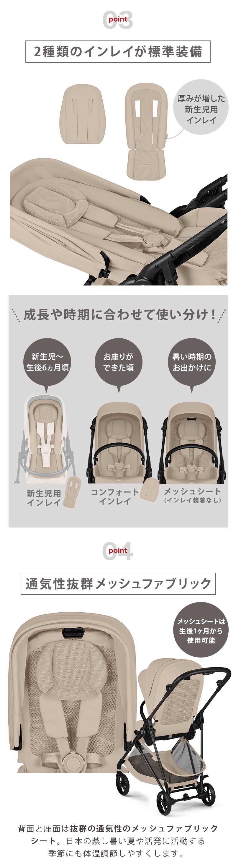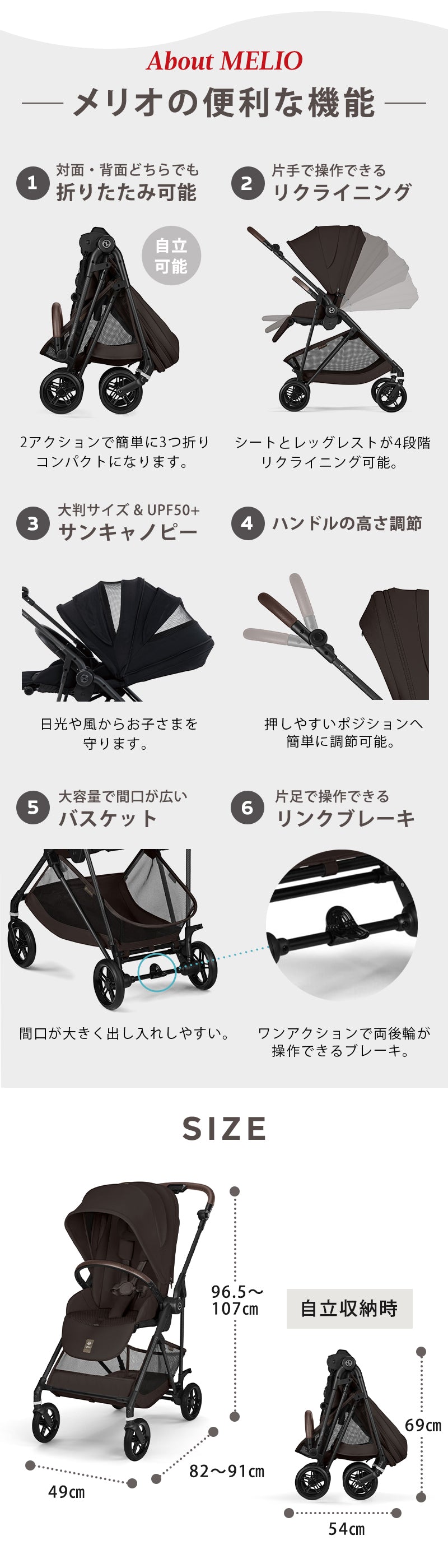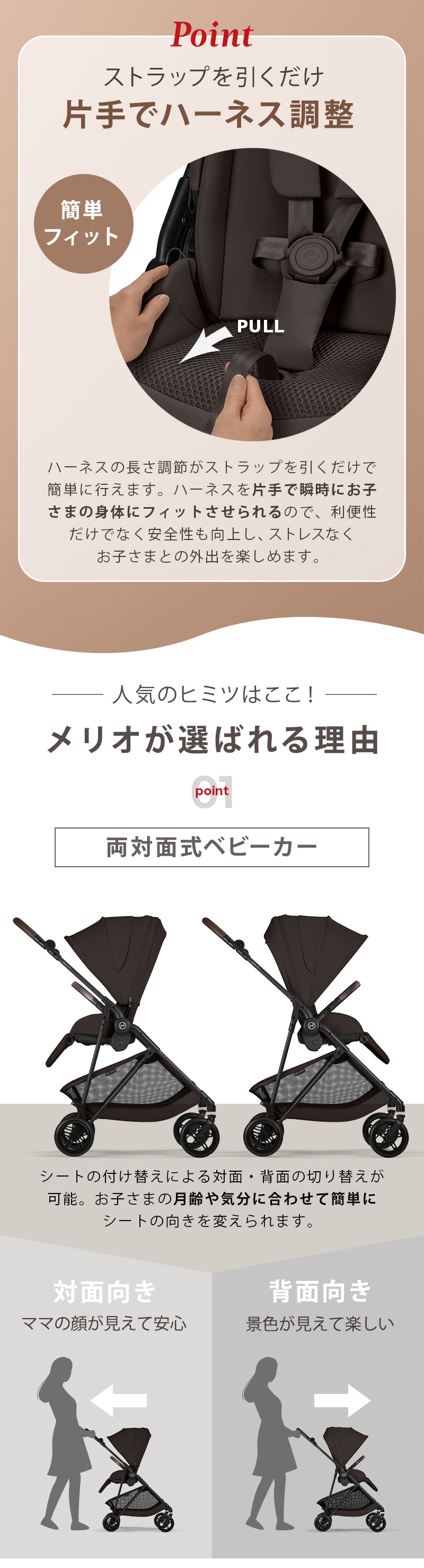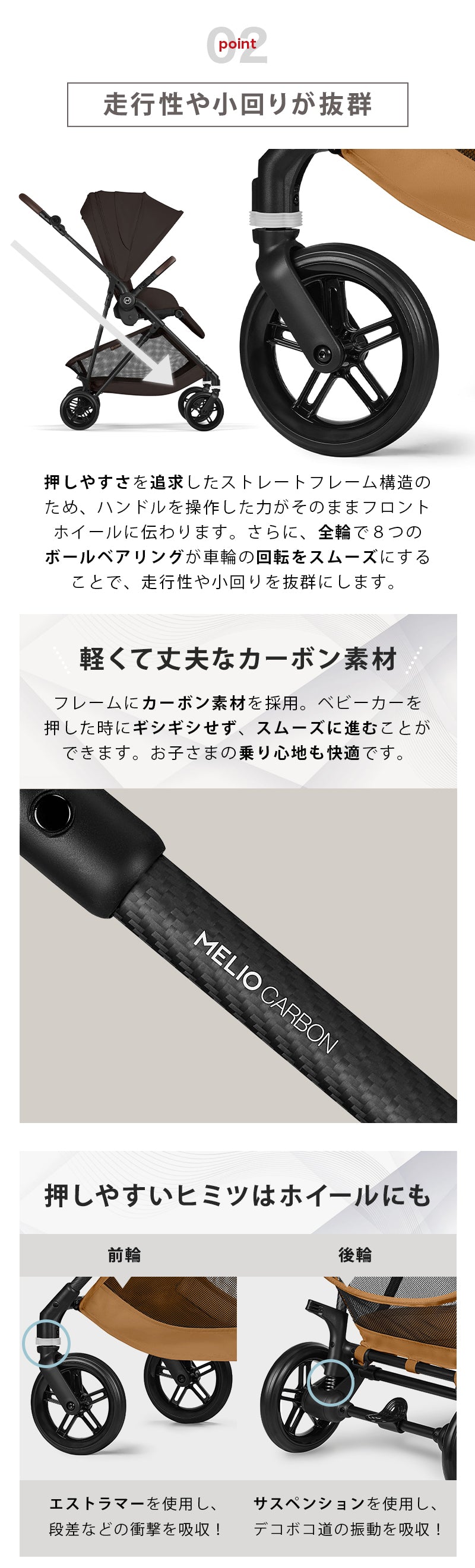 | 【メリオカーボン2026年モデル】 デザインとカラーラインナップを刷新して登場! 圧倒的な走行性、軽さ、そしてすべての機能の操作がわずかなアクションで完結します。 お子さまを抱っこしながらできる「片手開閉」、瞬時にハーネス調節可能な「ワンプルハーネス」、 ワンアクションで両後輪が操作できる「リンクブレーキ」、片手で調節可能な「リクライニングシート」など、 直感的でシンプルな操作で、だれでもすぐにメリオカーボンの機能を余すところなく使いこなすことができます。 そして使うたびに”簡単さ”を実感できるでしょう。 『2025年モデルから2026年モデルへのリニューアルポイント』 1.ショッピングバスケットのデザイン統一 2026年モデルでは、これまでブラックだったバスケットをシートカラーと統一しました。 色のつながりが生まれ、シンプルなモデルでありながら上質感のあるエレガントなデザインに進化しました。 2.カラーバリエーションの刷新 新色ニュアンスベージュ「 DUNE(デューン) 」と ゴールデン・キャメルブラウン「 CINNAMON YELLOW(シナモンイエロー) 」のトレンドカラーを追加し、全7色のラインナップへ。 幅広いスタイルに寄り添い、個性を引き立てる配色構成に進化しました。 【MELIO CARBON(メリオカーボン)とは?】 持って軽い「持ち運びの軽さ」・押して軽い「押し心地の軽さ」・ずっと軽い「生後1ヵ月から、大きくなってもずっと変わらず感じ続けられる、走行性の軽さ」。 この3つの軽さ「3カル」をかなえたヨーロッパデザイン、日本仕様の両対面軽量ストローラー(ベビーカー)です。 押しやすさを追求した構造で、楽に段差を乗り越えて小回りが効く、抜群の走行性を実現しています。 お子さまが生まれて、生後1ヵ月から3歳頃(~15kg)まで長くお使いいただけます。 トラベルシステム対応 専用 of カーシートアダプター(別売り)を取り付けることで、サイベックスのベビーシートを装着でき、新生児から使用することができます。 お子さまを寝かせたまま車や室内への移動ができる便利な機能です。 ※「クラウド」シリーズ、「エイトン」シリーズに適合。 適応月齢: 生後1か月~3歳(~15kg) |