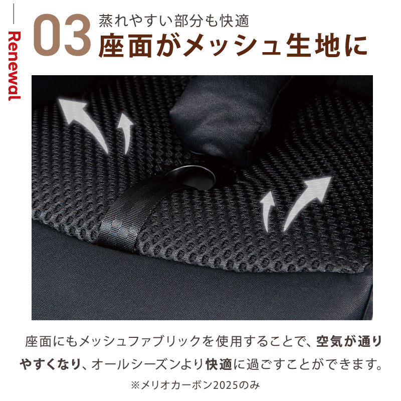 メリオカーボン2025年モデル 圧倒的な走行性と軽さはそのままに、片手で開閉できるようになりました。これにより、すべての機能と操作が最小限のアクションで完結します。 お子さまを抱っこしながらできる「片手開閉」、瞬時にハーネス調節可能な「ワンプルハーネス」、ワンアクションで両後輪が操作できる「リンクブレーキ」、片手で調節可能な「リクライニングシート」など、直感的でシンプルな操作で、だれでもすぐにメリオカーボンの機能を余すところなく使いこなすことができます。そして使うたびに”簡単さ”を実感できるでしょう。 「抜群の走行性」「軽さ」「シンプルな機能性」すべてを手に入れて、史上最高のメリオカーボンになりました。 2024年モデルから2025年モデルへのリニューアルポイント ・お子さまを抱っこしたまま、お子さまと手を繋いだまま、荷物を持ったまま、片手で開閉できることで、もう片方の手を自由に使うことができます。 ・メッシュウィンドウが拡大。サイドまで広がったことで、さまざまな角度からお子さまを見守ることができ、さらに背面のメッシュシートと合わせてシート内の空気の流れをよくします。 ・座面にもメッシュファブリックを使用することで、空気が通りやすくなり、オールシーズンより快適に過ごすことができます。 MELIO CARBON(メリオカーボン)とは? 持って軽い「持ち運びの軽さ」・押して軽い「押し心地の軽さ」・ずっと軽い「生後1ヵ月から、大きくなってもずっと変わらず感じ続けられる、走行性の軽さ」。この3つの軽さ「3カル」をかなえたヨーロッパデザイン、日本仕様の両対面軽量ストローラー(ベビーカー)です。 押しやすさを追求した構造で、楽に段差を乗り越えて小回りが効く、抜群の走行性を実現しています。お子さまが生まれて、生後1ヵ月から3歳頃(~15kg)まで長くお使いいただけます。 ハーネスの長さ調節が、ストラップを引くだけで簡単に行えます。ハーネスを片手で瞬時にお子さまの体にフィットさせられるので、利便性だけでなく安全性も向上し、ストレスなくお子さまとの外出を楽しめます。 トラベルシステム対応 専用のカーシートアダプター(別売り)を取り付けることで、サイベックスのベビーシートを装着でき、新生児から使用することができます。 お子さまを寝かせたまま車や室内への移動ができる便利な機能です。 ※「クラウド」シリーズ、「エイトン」シリーズに適合。 適応月齢: 生後1か月~3歳(~15kg) |