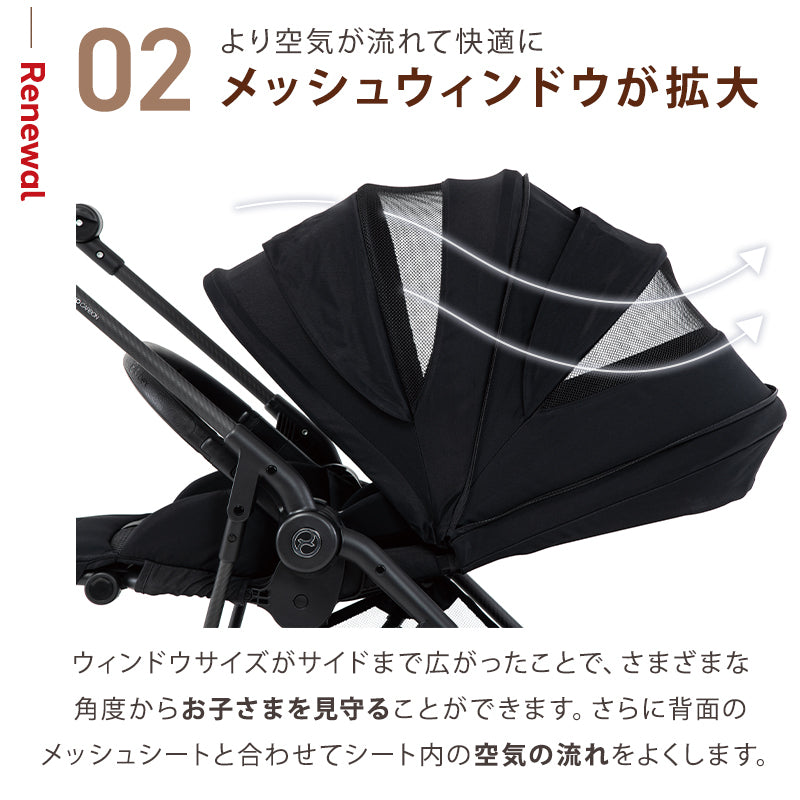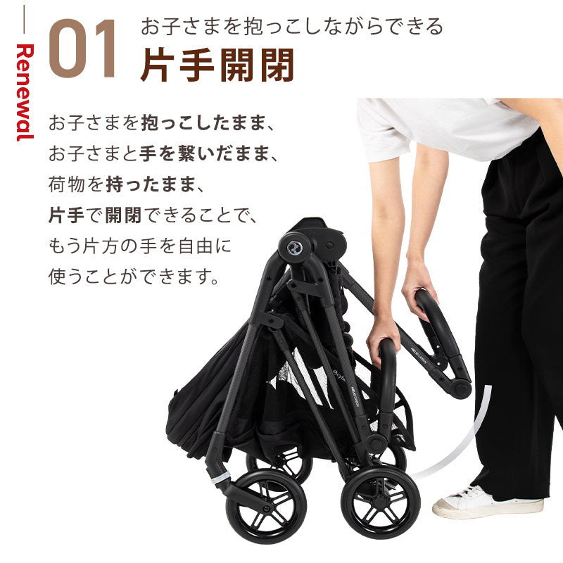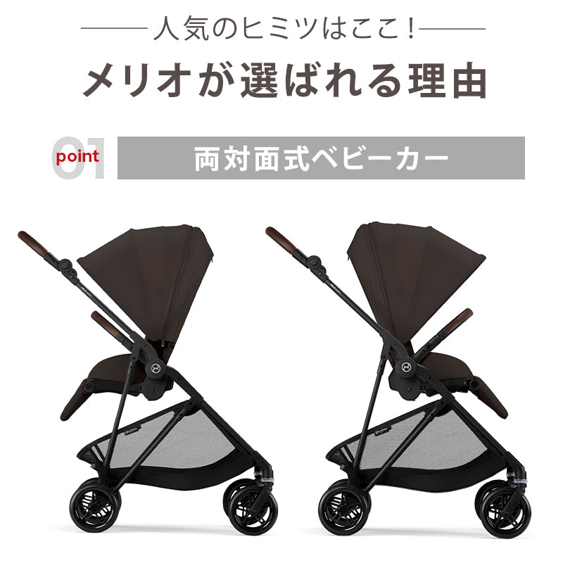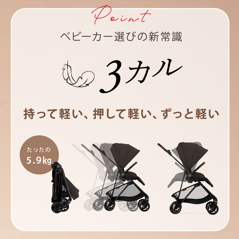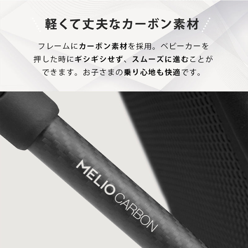 メリオカーボン2025年モデル 圧倒的な走行性と軽さはそのままに、片手で開閉できるようになりました。これにより、すべての機能と操作が最小限のアクションで完結します。 お子さまを抱っこしながらできる「片手開閉」、瞬時にハーネス調節可能な「ワンプルハーネス」、ワンアクションで両後輪が操作できる「リンクブレーキ」、片手で調節可能な「リクライニングシート」など、直感的でシンプルな操作で、だれでもすぐにメリオカーボンの機能を余すところなく使いこなすことができます。そして使うたびに”簡単さ”を実感できるでしょう。 「抜群の走行性」「軽さ」「シンプルな機能性」すべてを手に入れて、史上最高のメリオカーボンになりました。 2024年モデルから2025年モデルへのリニューアルポイント ・お子さまを抱っこしたまま、お子さまと手を繋いだまま、荷物を持ったまま、片手で開閉できることで、もう片方の手を自由に使うことができます。 ・メッシュウィンドウが拡大。サイドまで広がったことで、さまざまな角度からお子さまを見守ることができ、さらに背面のメッシュシートと合わせてシート内の空気の流れをよくします。 ・座面にもメッシュファブリックを使用することで、空気が通りやすくなり、オールシーズンより快適に過ごすことができます。 MELIO CARBON(メリオカーボン)とは? 持って軽い「持ち運びの軽さ」・押して軽い「押し心地の軽さ」・ずっと軽い「生後1ヵ月から、大きくなってもずっと変わらず感じ続けられる、走行性の軽さ」。この3つの軽さ「3カル」をかなえたヨーロッパデザイン、日本仕様の両対面軽量ストローラー(ベビーカー)です。 押しやすさを追求した構造で、楽に段差を乗り越えて小回りが効く、抜群の走行性を実現しています。お子さまが生まれて、生後1ヵ月から3歳頃(~15kg)まで長くお使いいただけます。 ハーネスの長さ調節が、ストラップを引くだけで簡単に行えます。ハーネスを片手で瞬時にお子さまの体にフィットさせられるので、利便性だけでなく安全性も向上し、ストレスなくお子さまとの外出を楽しめます。 トラベルシステム対応 専用のカーシートアダプター(別売り)を取り付けることで、サイベックスのベビーシートを装着でき、新生児から使用することができます。 お子さまを寝かせたまま車や室内への移動ができる便利な機能です。 ※「クラウド」シリーズ、「エイトン」シリーズに適合。 適応月齢: 生後1か月~3歳(~15kg) |