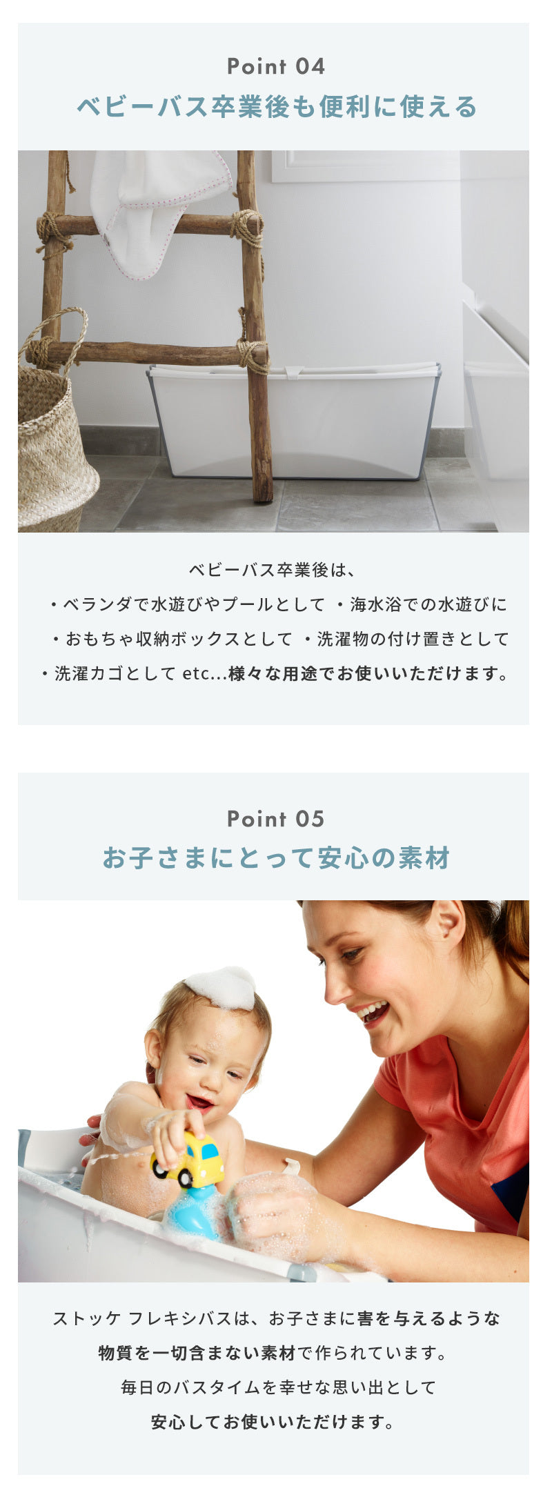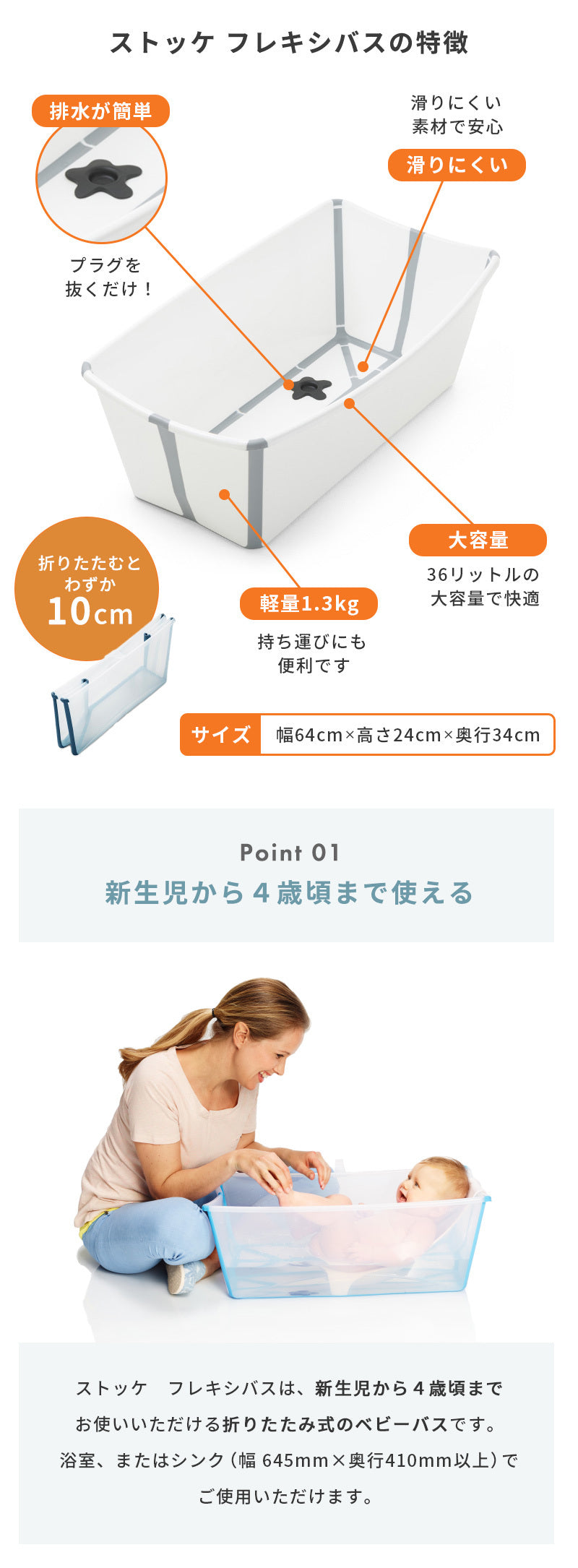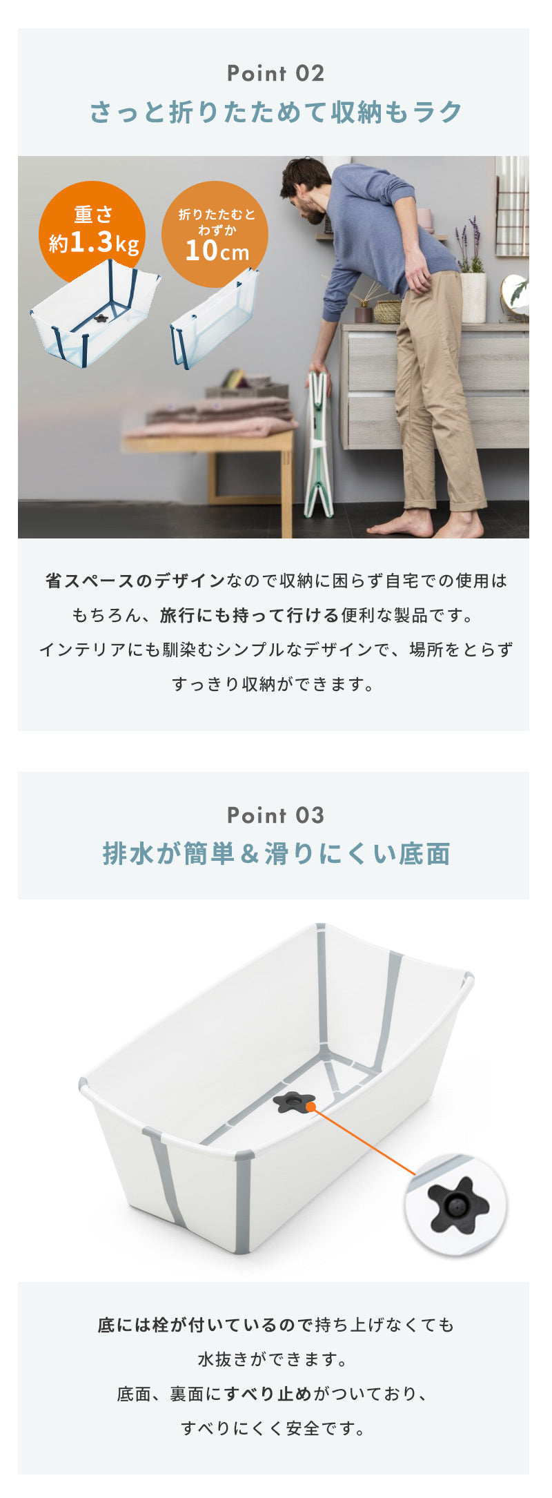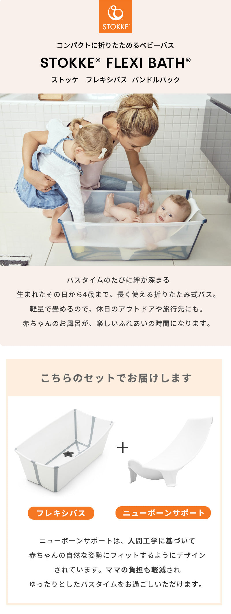 【FLEXI BATH バンドルパック】 はじめてのきもちいいお風呂に。ストッケの折りたためるベビーバス ありそうでなかった折りたたみ式ベビーバス。 コンパクトに収納でき、持ち運びもらくらく。コンパクトでありながら容量は36L。 すべりにくい素材の底には栓があるので排水も簡単です。 ニューボーンサポートを使用すれば首が座っていないベビーの体をしっかり支え、より安定して沐浴が可能です。 新生児の人間工学に基づいたデザインとして国内外の賞を受賞。 お子様が成長したら収納ボック等、長く使用できます。 コンパクトなので、里帰り出産や、帰省、旅行にも便利ですね。 |