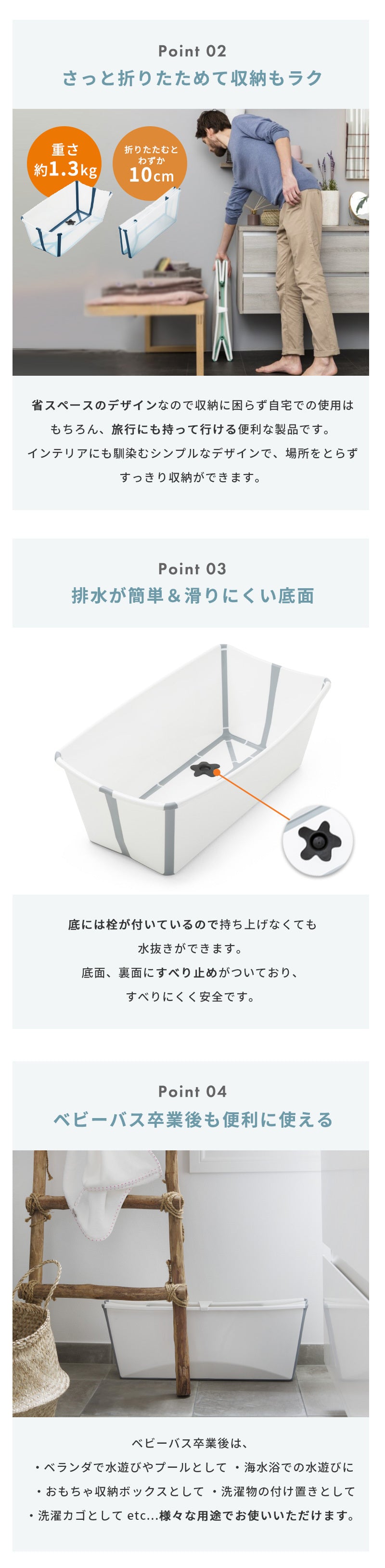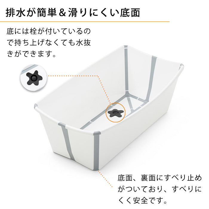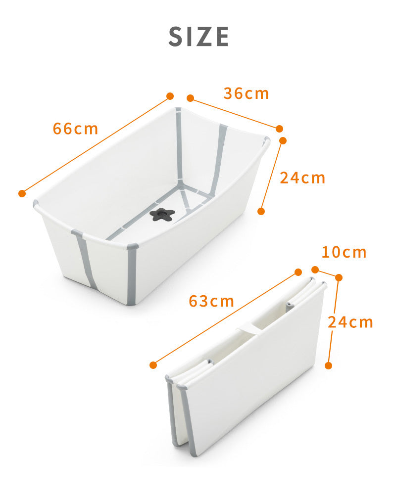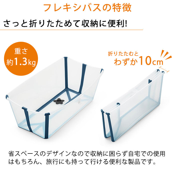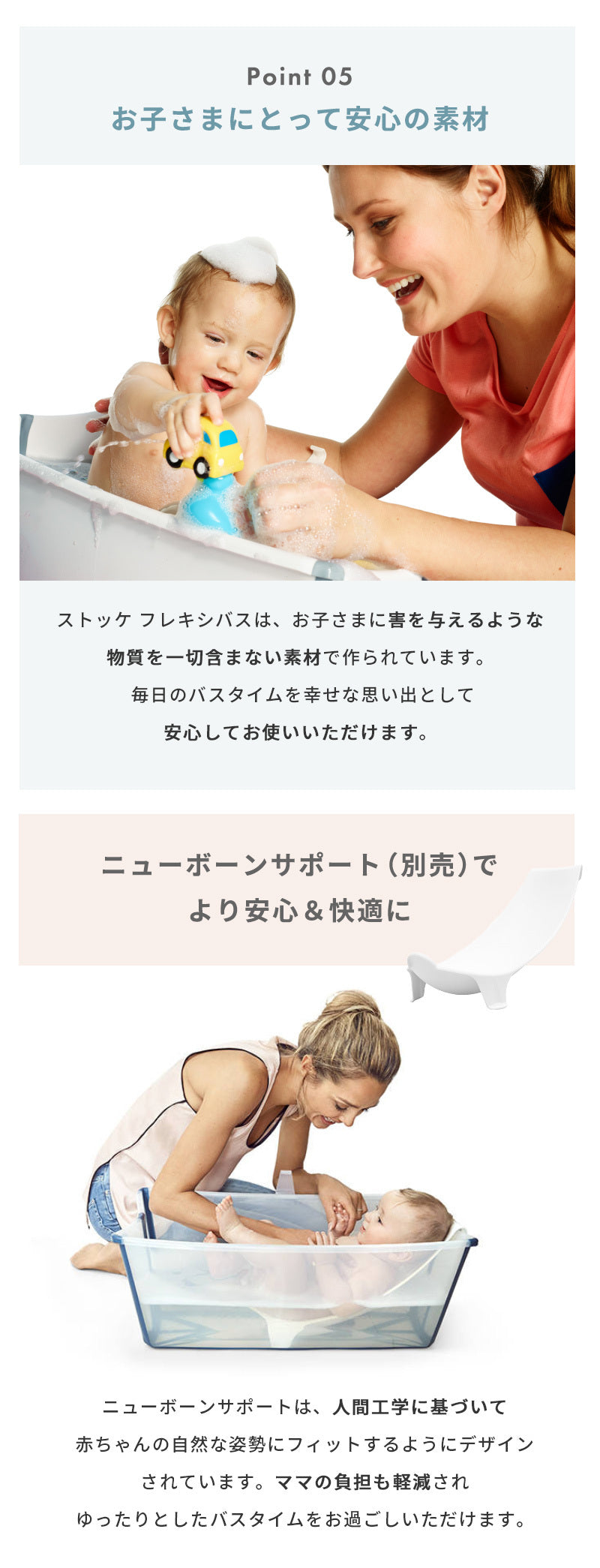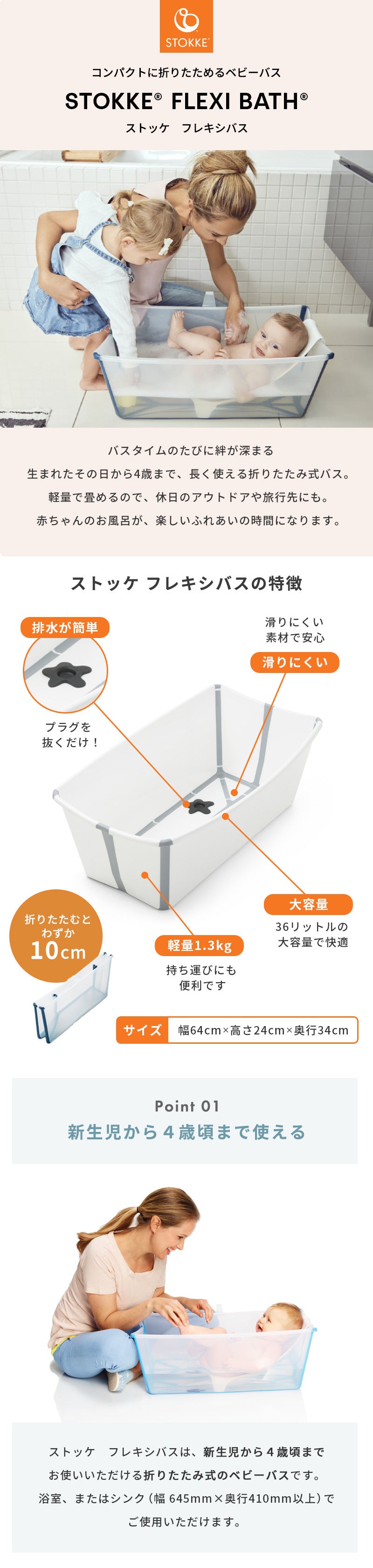 【FLEXI BATH】 はじめてのきもちいいお風呂に。ストッケの折りたためるベビーバス ありそうでなかった折りたたみ式ベビーバス。 コンパクトに収納でき、持ち運びもらくらく。コンパクトでありながら容量は36L。 すべりにくい素材の底には栓があるので排水も簡単です。 別売りのニューボーンサポートを使用すれば首が座っていないベビーの体をしっかり支え、より安定して沐浴が可能です。 新生児の人間工学に基づいたデザインとして国内外の賞を受賞。 お子様が成長したら収納ボック等、長く使用できます。 コンパクトなので、里帰り出産や、帰省、旅行にも便利ですね。 |