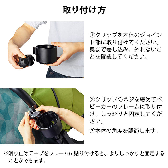 ご注意 | ・本製品に買い物袋などを掛けないでください。ベビーカーの店頭につながり危険です。 ・本製品の使用前にジョイント部、ベビーカーへの取りつけに緩みがないか確認してください。取り付けが不完全だと外れる恐れがあります。 ・付属のすべり止めテープを使用しない場合は、お子さまの手の届かないところに保管してください。飲み込むと窒息する恐れがあります。 ・素材の性質上、アルコール成分を含む除菌シートなどで拭くと、変色、変質、変形など製品が劣化する恐れがあります。変形破損した場合は使用を中止してください。 |