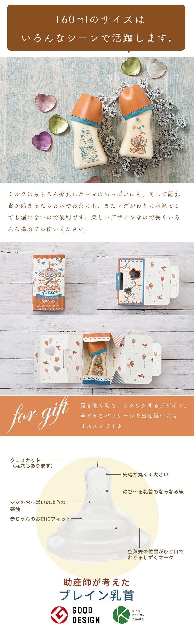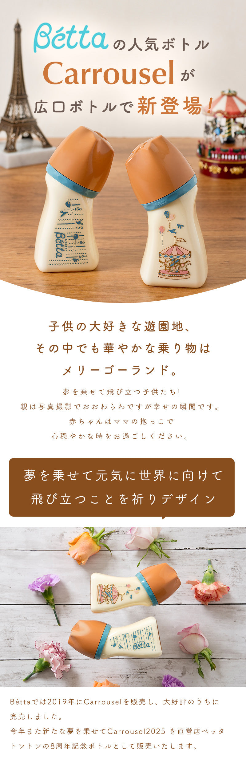| 【Carrousel】 Bettaの人気ボトル「Carrousel」が広口ボトルで新登場! 子供の大好きな遊園地、その中でも華やかな乗り物はメリーゴーランド。 夢を乗せて飛び立つ子供たち!親は写真撮影でおおわらわですが幸せの瞬間です。 赤ちゃんはママの抱っこで心穏やかな時をお過ごしください。 夢を乗せて元気に世界に向けて飛び立つことを祈りデザインしました。 Béttaでは2019年にCarrouselを販売し、大好評のうちに完売しました。 今年また新たな夢を乗せてCarrousel2025 を直営店ベッタトントンの8周年記念ボトルとして販売いたします。 160mlのサイズはいろんなシーンで活躍します。 ミルクはもちろん搾乳したママのおっぱいにも、そして離乳食が始まったらお水やお茶にも、 またマグがわりに水筒としても漏れないので便利です。 楽しいデザインなので長くいろんな場所でお使いください。 |