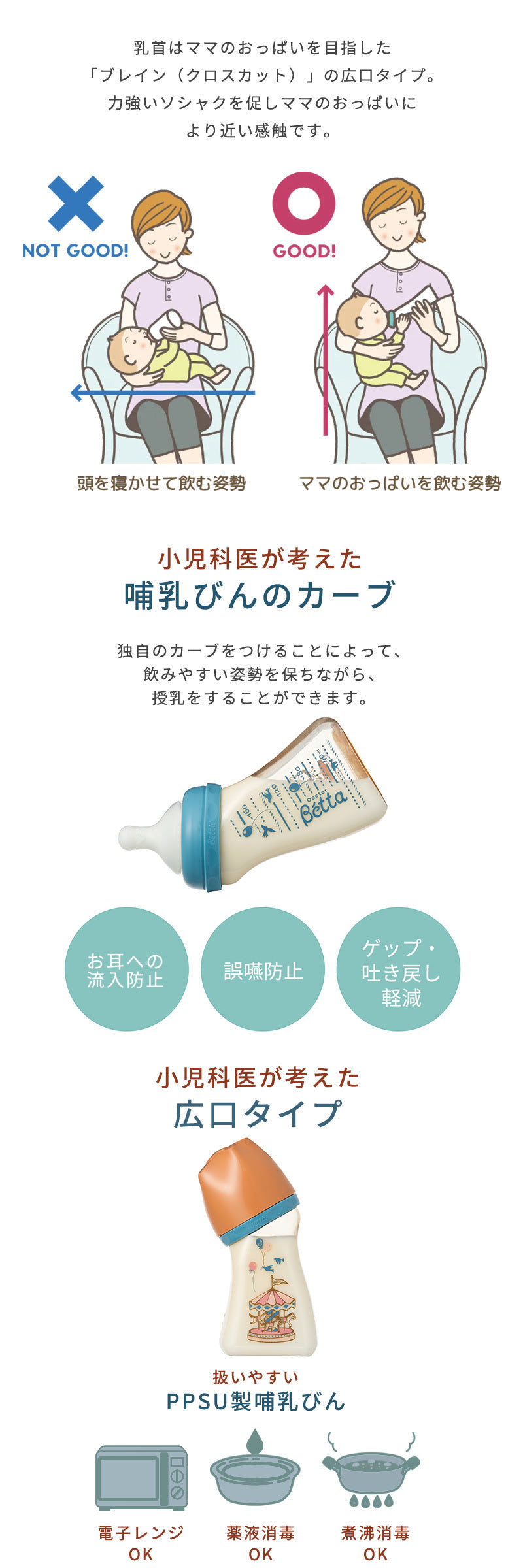 | ドクターベッタの広口タイプは、ドクターベッタ哺乳びんの利点「お耳に安心+誤嚥を防ぐ+ゲップの軽減」に加え、 洗いやすく、さらに調乳がしやすく、咥えた時の触感がママのおっぱいにより近い哺乳びんです。 また、ぽっちゃりしたカタチは安定感があり倒れにくいため、調乳などの際は快適に使用することができます。 |