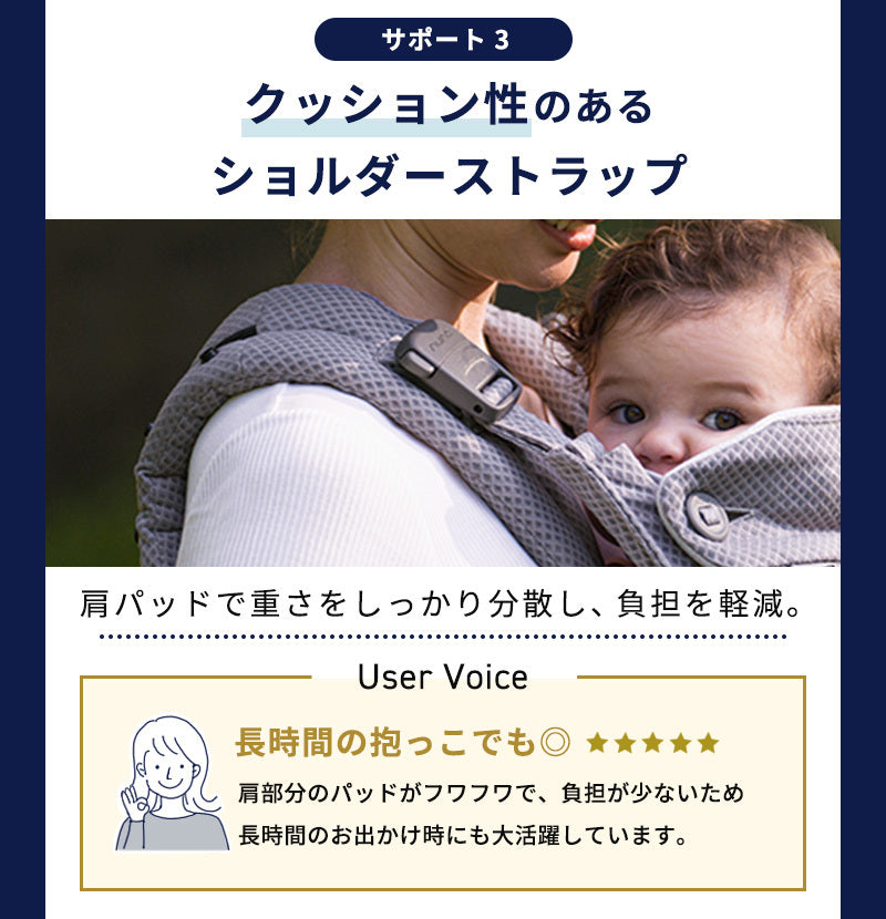 新生児から3歳まで(16kg) 抱き方別使用対象 対面抱っこ(乳幼児ブースターあり):4カ月未満(首すわり前)体重3.5~7kg 対面抱っこ:4カ月以上(首すわり後)体重7~13.5kg 前向抱っこ:6か月以上 体重9~13.5kg おんぶ:9カ月以上 体重11~16kg |