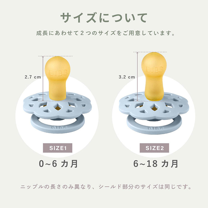 ※天然ゴムラテックスは天然素材のため、色のばらつきが生じる場合があります。 ※ラテックスアレルギーをお持ちの方はご使用をお控えください。 ※本商品の一部にニップルの製造時に使われているシリコンオイルが付着していることがございます。人体に影響がない無害なものです。 ※初回ご使用前に必ず5分間煮沸してください。 ※メーカー推奨使用期間として衛生上の理由によりbibs 天然ゴム製のおしゃぶりは4~6週間ごとにお取り替えください。 ※天然ゴムは天然素材の特性上、温度・光・紫外線等の外的要因による経年劣化によりゴム部分が膨張する場合がございます。その場合は直ちにお取り替えください |