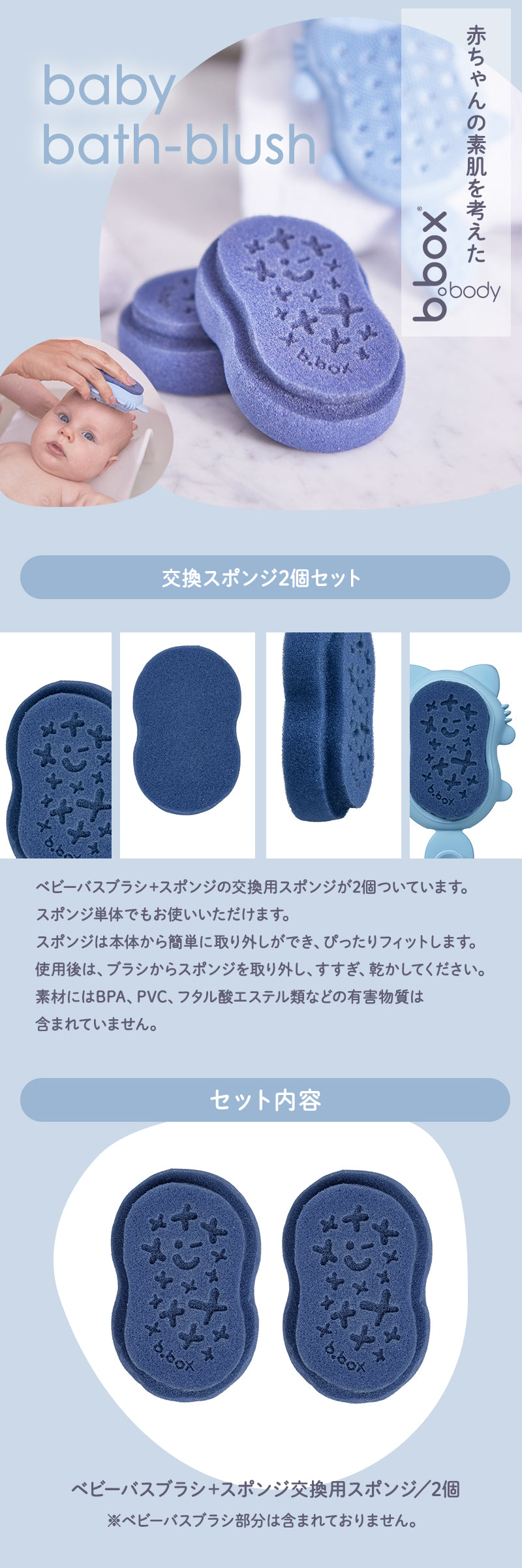 | ベビーバスブラシ+スポンジの交換用スポンジが2個ついています。 スポンジ単体でもお使いいただけます。 スポンジは本体から簡単に取り外しができ、ぴったりフィットします。 使用後は、ブラシからスポンジを取り外し、すすぎ、乾かしてください。 素材にはBPA、PVC、フタル酸エステル類などの有害物質は含まれていません。 |