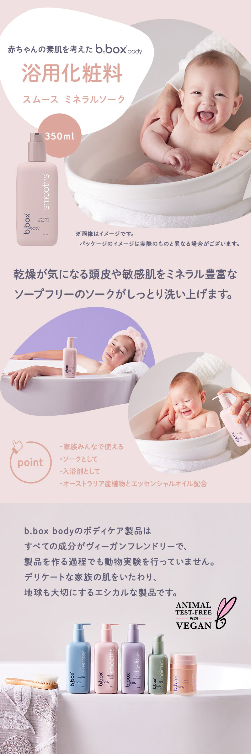 | ビーボックスから新しく『b.box body』シリーズが発売されました。 赤ちゃんの素肌を考えたスキンケア商品からバスグッズまで、 お風呂をより素敵なひとときにしてくれるシリーズの登場です。 赤ちゃんの繊細で柔らかな素肌をb.box bodyと共に優しく包み込みませんか? 【b.box body smooths〈浴用化粧料〉】 乾燥が気になる頭皮や敏感肌をミネラル豊富なソープフリーのソークがしっとり洗い上げます。 |