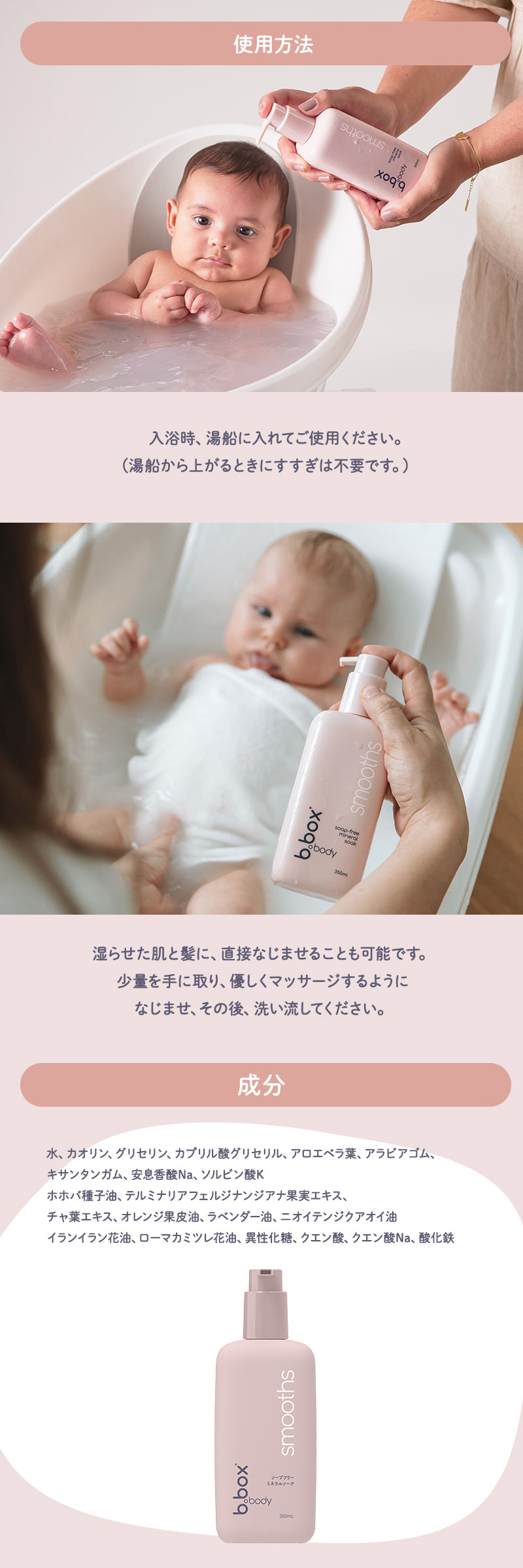 | 入浴時、湯船に入れてご使用ください。(湯船から上がるときにすすぎは不要です。)湿らせた肌と髪に、直接なじませることも可能です。 少量を手に取り、優しくマッサージするようになじませ、その後、洗い流してください。 入浴後の保湿には、b.box bodyハイドレード ボディローション、b.box bodyモイスチャ- ボディ+バスオイルのご使用がおすすめです。 |