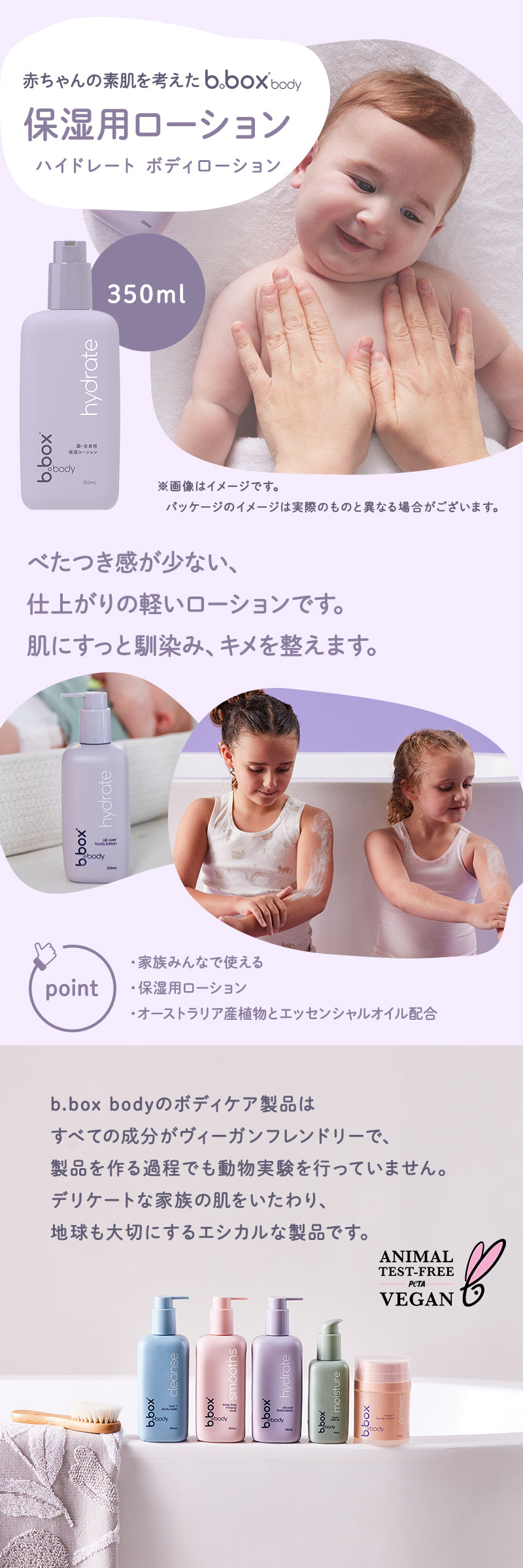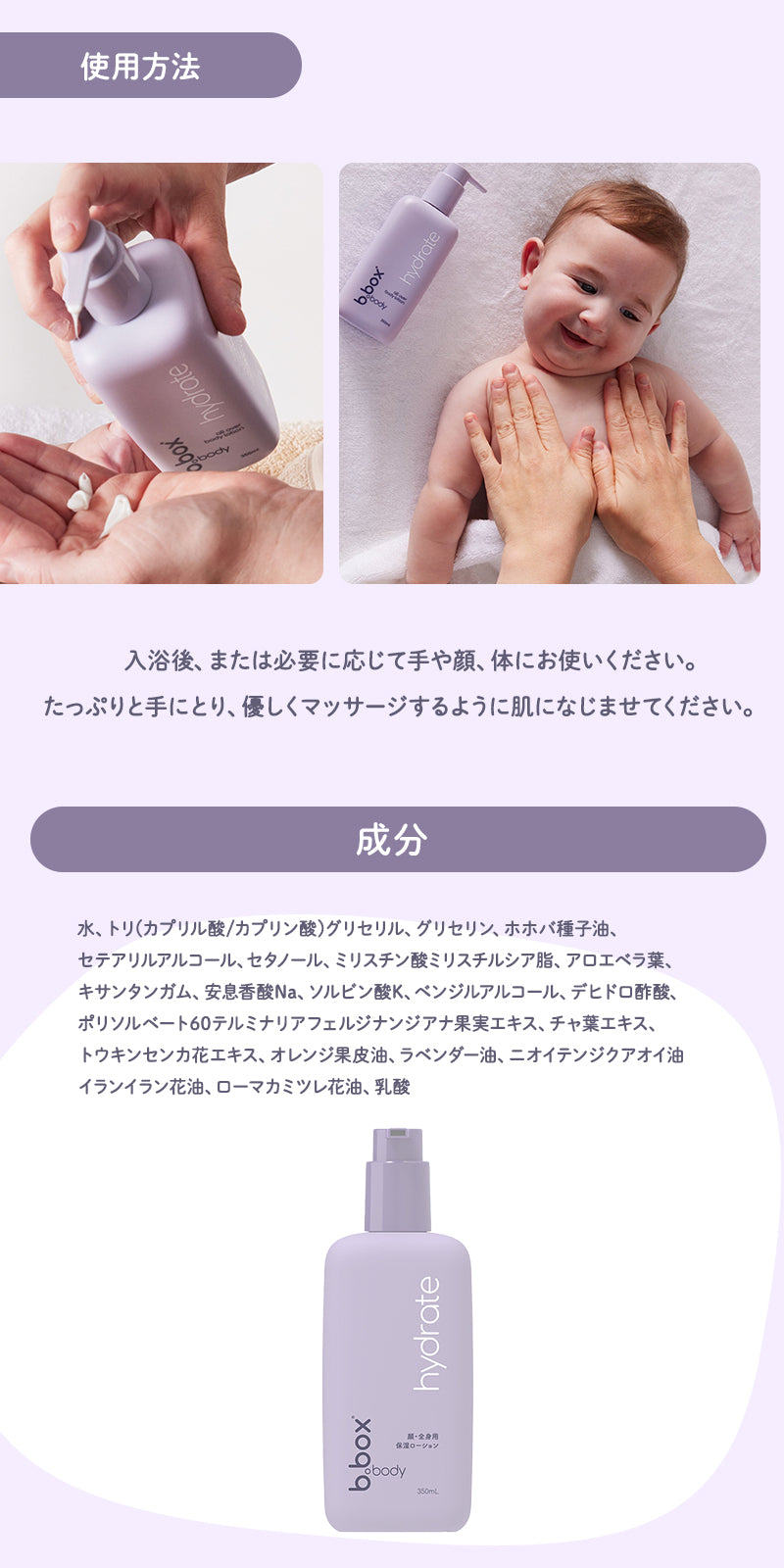 | 入浴後、または必要に応じて手や顔、体にお使いください。たっぷりと手にとり、優しくマッサージするように肌になじませてください。 b.box body クレンズ ヘア+ボディウォッシュ、b.box body スムース ミネラルソークのご使用後に、お使いいただくのがおすすめです。 |