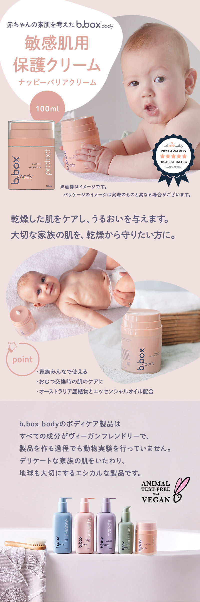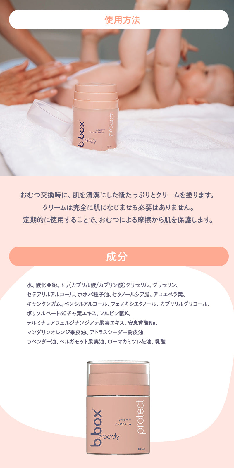 | おむつ交換時に、肌を清潔にした後たっぷりとクリームを塗ります。 クリームは完全に肌になじませる必要はありません。定期的に使用することで、おむつによる摩擦から肌を保護します。 b.box body スムース ミネラルソークのご使用後の、保湿ケアとしておすすめです。 |