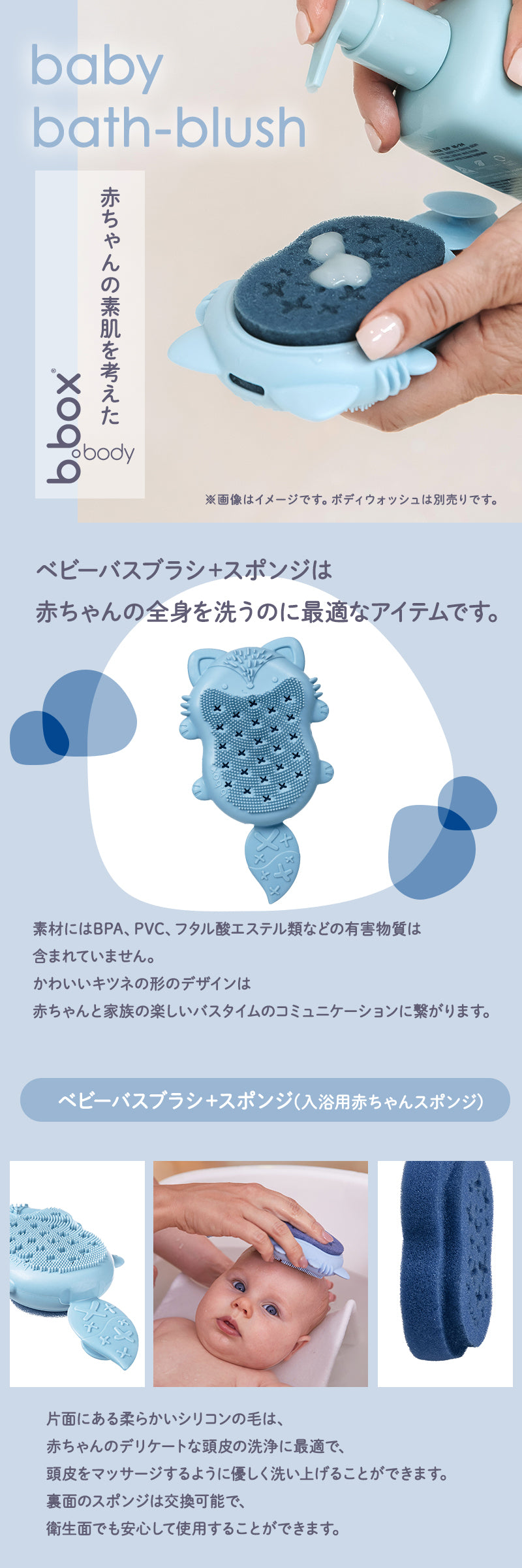 | ビーボックスから新しく『b.box body』シリーズが発売されました。 赤ちゃんの素肌を考えたスキンケア商品からバスグッズまで、 お風呂をより素敵なひとときにしてくれるシリーズの登場です。 赤ちゃんの繊細で柔らかな素肌をb.box bodyと共に優しく包み込みませんか? 【ベビーバスブラシ+スポンジ(入浴用赤ちゃんスポンジ)】 柔らかいシリコン素材のブラシとスポンジの両面で赤ちゃんのデリケートな肌を優しく洗い上げる |