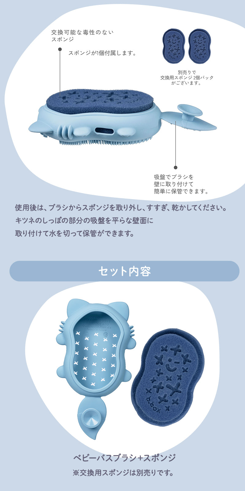 | ベビーバスブラシ+スポンジは赤ちゃんの全身を洗うのに最適なアイテムです。 素材にはBPA、PVC、フタル酸エステル類などの有害物質は含まれていません。 かわいいキツネの形のデザインは赤ちゃんと家族の楽しいバスタイムのコミュニケーションに繋がります。 新生児の沐浴の際はもちろん、家族全員で使うことができます。片面にある柔らかいシリコンの毛は、赤ちゃんのデリケートな頭皮の洗浄に最適で、 頭皮をマッサージするように優しく洗い上げることができます。裏面のスポンジは交換可能で、衛生面でも安心して使用することができます。 ※ベビーバスブラシ+スポンジ本体にはスポンジが1個付属します。交換用スポンジは別売りです。 使用後は、ブラシからスポンジを取り外し、すすぎ、乾かしてください。 キツネの「しっぽ」の部分の吸盤を平らな壁面に取り付けて水を切って保管ができます。 |