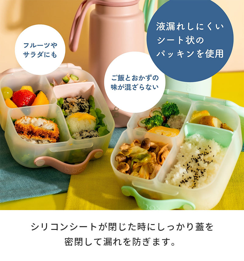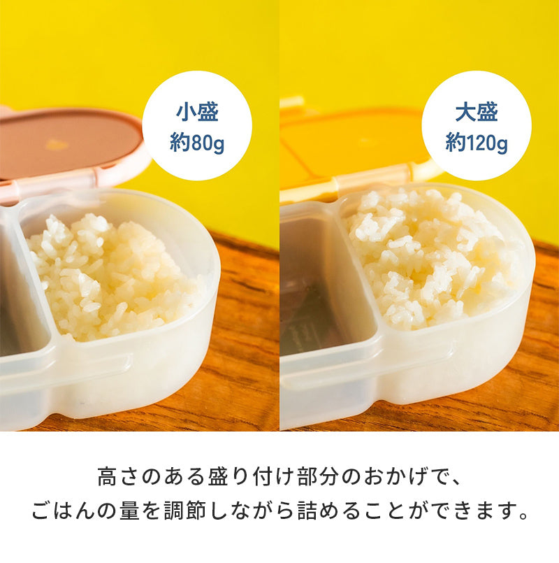 幼児や少食の方のお弁当や、外出先でのおやつの持ち運びに便利なコンパクトサイズ。 通園時にお子さんの手でも開けやすく、閉めやすいようにロック部分が一箇所になっています。 パッキンも蓋の裏と一体型になっているのでズレて、蓋がはまりにくくなる心配が要りません。 さらに、パッキンがシート状になっているので密閉力が高まり、お弁当箱が傾いても液漏れしにくい構造になっています。(※完全に漏れを防ぐものではありません。) 仕切りもあるので、ご飯とおかずの味が混ざらず、栄養を考えた盛り付けをすることができます。 |