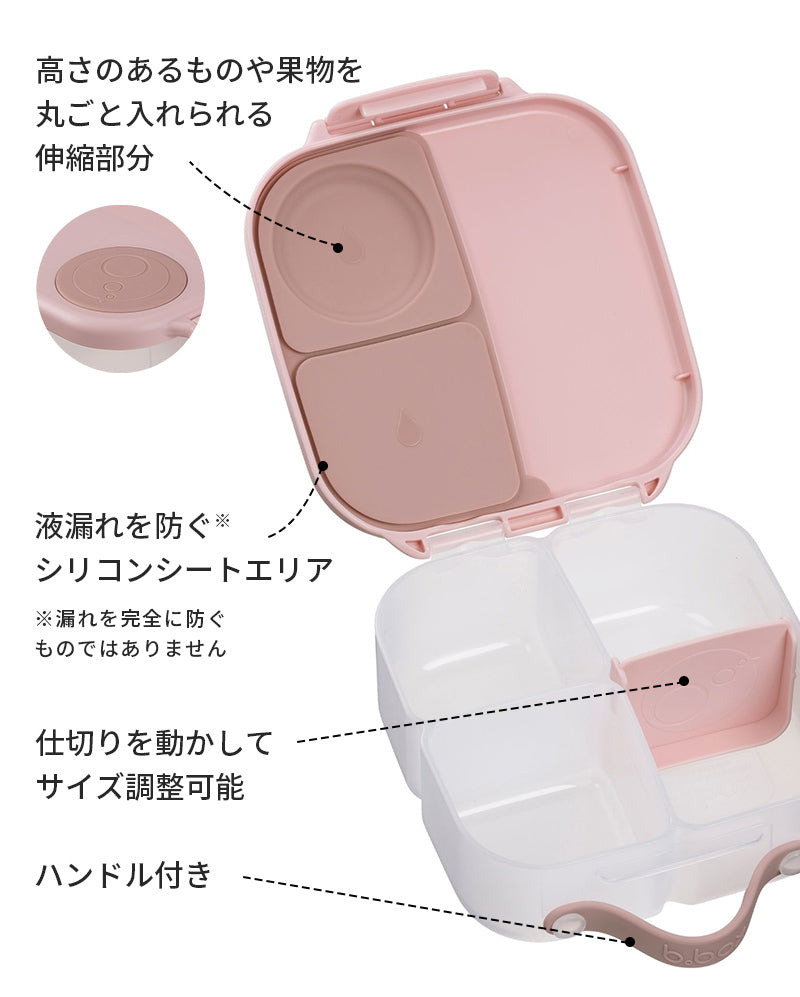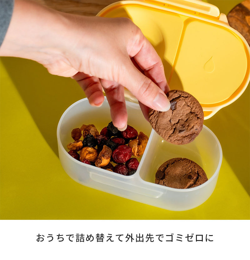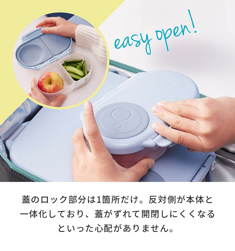 仕切りと深さがあるミニランチボックスは、ご飯はもちろん、パスタやサンドウィッチなどの主食も入れられる万能型のお弁当箱です。 ミニランチボックスは一箇所、可動式の仕切り部分があります。 深さを使用して詰める量を調整できるので、子どもから大人まで幅広い年齢層に対応できます。 ロック部分は一箇所のみで蓋の開け閉めが楽になっています。 さらに蓋の裏には、液漏れしにくくするシリコン製のシート状のパッキンが付属しており、 フルーツやサラダなど汁漏れが気になるメニューも一緒に盛り付けることができます。 メインのものと分けずに済むので、洗い物も少なくなる上、環境にも優しいアイテムです。 |