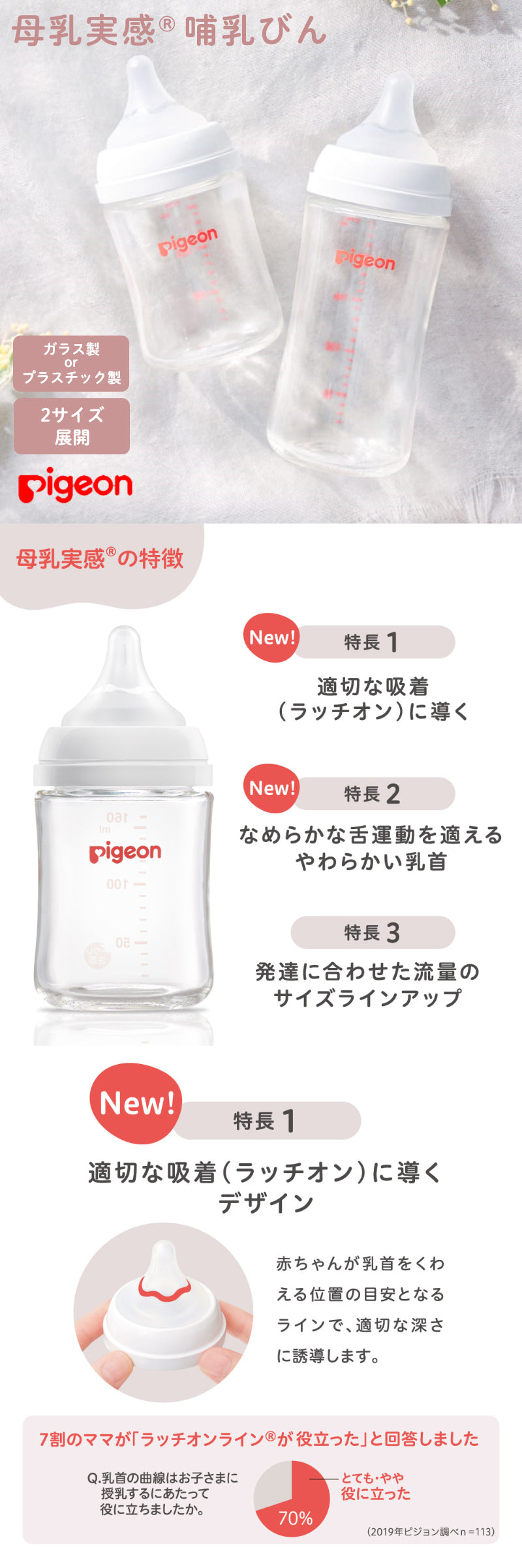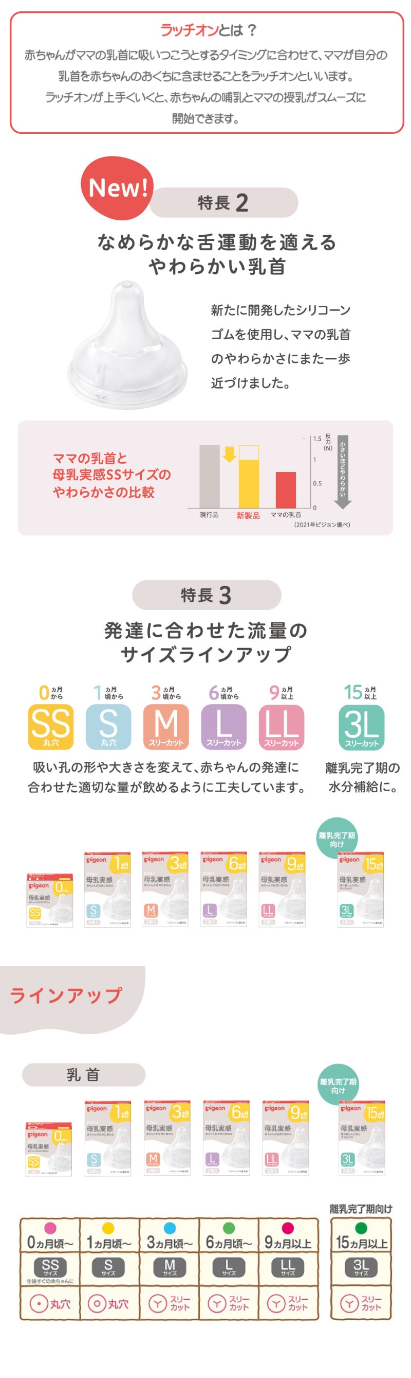 | 「おっぱいとの併用がスムーズであること」 「おっぱいと同じ口の動きで飲めること」を目指して開発された「母乳実感®」哺乳びんと乳首。 赤ちゃんの適切な吸着(ラッチオン)となめらかな舌の動きを叶え、母乳育児を心地よくアシストします。 ■乳首をくわえる深さの目安となる「ラッチオンライン®」 赤ちゃんが乳首をくわえる深さの目安となる波型のライン。 赤ちゃんにどこまでくわえさせていいのか不安なママとパパのための「くわえる深さ」の目安となるラインです。 この「ラッチオンライン®」が、赤ちゃんの適切な吸着(ラッチオン)へ導き、スムーズな授乳をサポートします。 ※ラッチオンとは、赤ちゃんがママの乳首に吸いつこうとするタイミングに合わせて、ママが自分の乳首を赤ちゃんのおくちに含ませること。 ラッチオンが上手くいくと、赤ちゃんの哺乳とママの授乳がスムーズに開始できます。 ■赤ちゃんのなめらかな舌の動きを叶える「やわらかさ」 赤ちゃんにスムーズに飲んでもらうためには、哺乳びんの乳首にもママのおっぱいのような「やわらかさ」が必要です。 それを実現するために開発された、母乳実感乳首専用のシリコーンゴムを採用。 ママの乳首のやわらかさに、また一歩近づきました。 ■赤ちゃんの発達に合わせて選べる6サイズ ピジョンの長年の研究から、発達に合っていない多すぎる流量は、赤ちゃんの呼吸に負担をかけることがわかっています。 そのため、「母乳実感®」乳首は、赤ちゃんの発達に合わせた適切な量が飲めるように、乳首の吸い穴の形や大きさを変えて6サイズから選べるようにしています。 ■持ちやすい太さと使いやすい広口ボトル ママの声を参考に、持ちやすい太さとカーブのボトルに。 使った後も洗いやすく、調乳もしやすい広口タイプです。 |