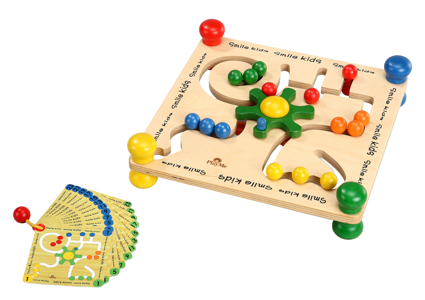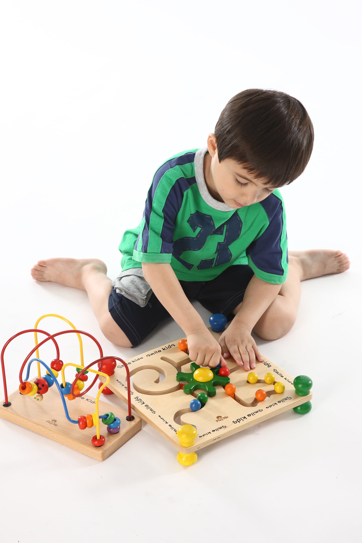 くねくね曲がった迷路のような道を木製ビーズを自由に動かして遊びます。指先をいっぱい使い、細かい作業を遊びの中に取り入れられます。3歳頃になると、パターンカードを使って、同じ位置に木製ビーズを移動させ