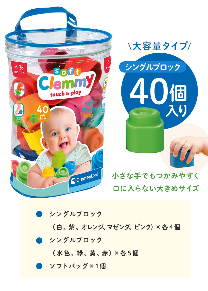 赤ちゃんにはじめての知育ブロック やわらか素材で小さな赤ちゃんにも安心して使えます。 1963年創業以来50年以上にわたって世界中で愛されているイタリアの老舗おもちゃブランド「Clementoni」の知育ブロック。 やわらかな素材&過度のない形状で、踏んでも崩してもいたくないので小さなお子さんでも楽しくブロック遊びが楽しめます。 |