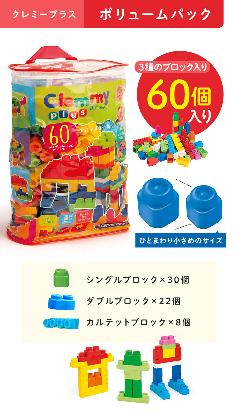 クレミープラスはベビークレミーよりもひとまわり小さめのサイズで、より細かな作品を作ることができます。 ブロックが60個入ったボリュームパックです。 |