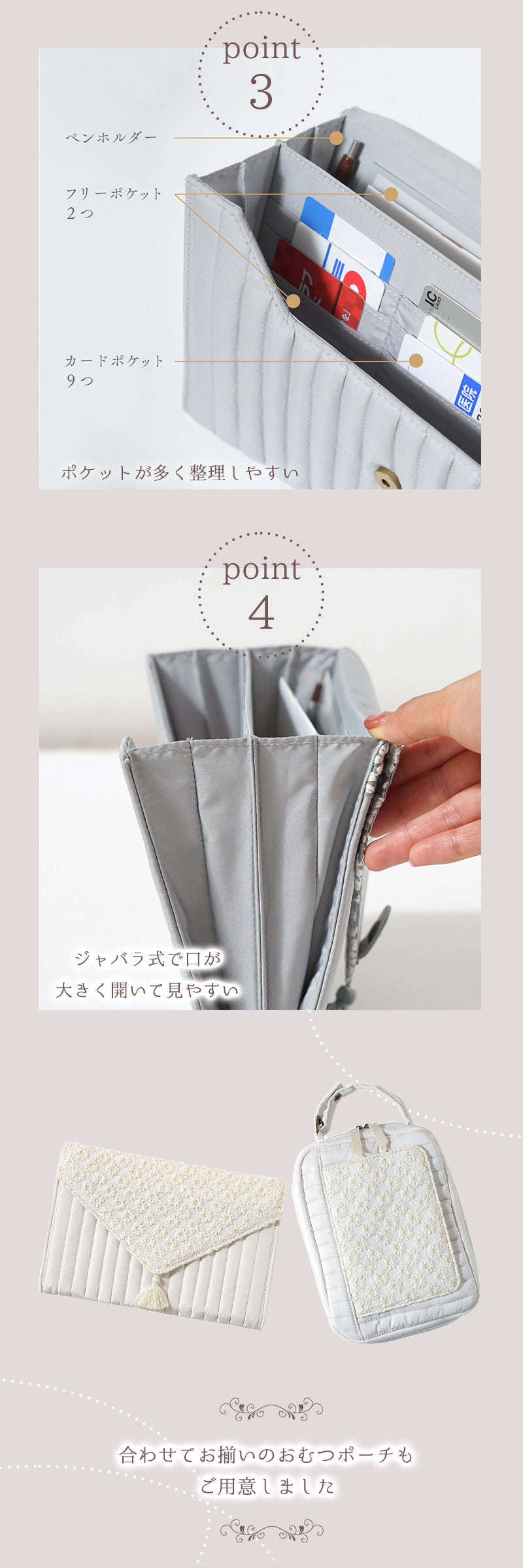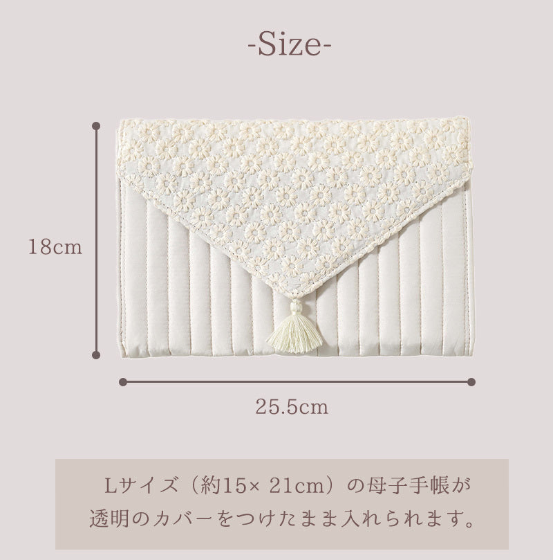 Lサイズ(約15×21cm)の母子手帳が、透明のカバーをつけたまま入れられます。