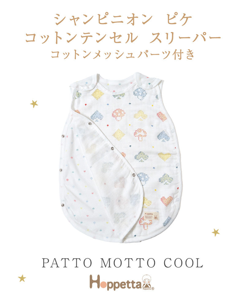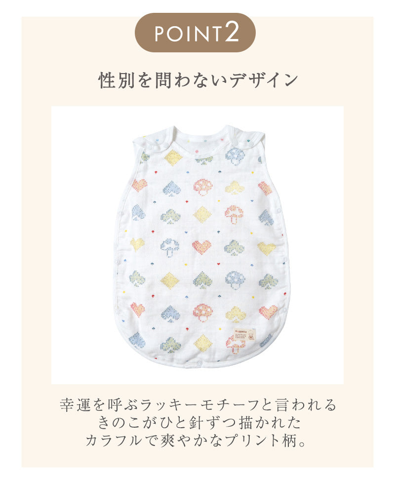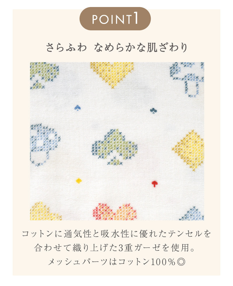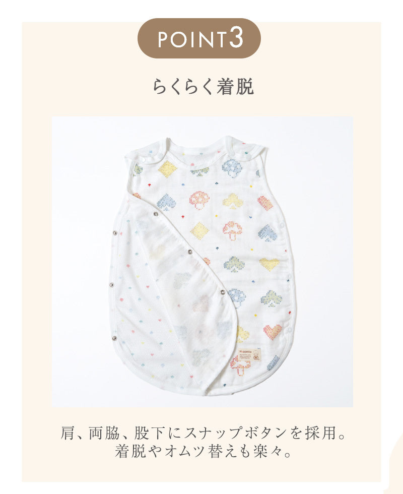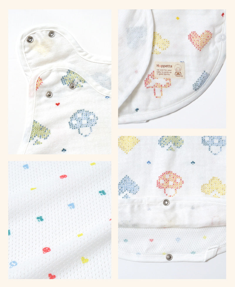 | 【3重ガーゼスリーパー】 幸運を呼ぶラッキーモチーフ、シャンピニオン ピケ柄。カラフルで爽やかなクロスステッチ風デザイン。 ・肩、両脇、股下にスナップボタンを採用。着脱やオムツ替えも楽々。 【メッシュパーツ】 ・おなかは冷やさず、背中は涼しく。気温の変化に対応する便利なパーツ。 |