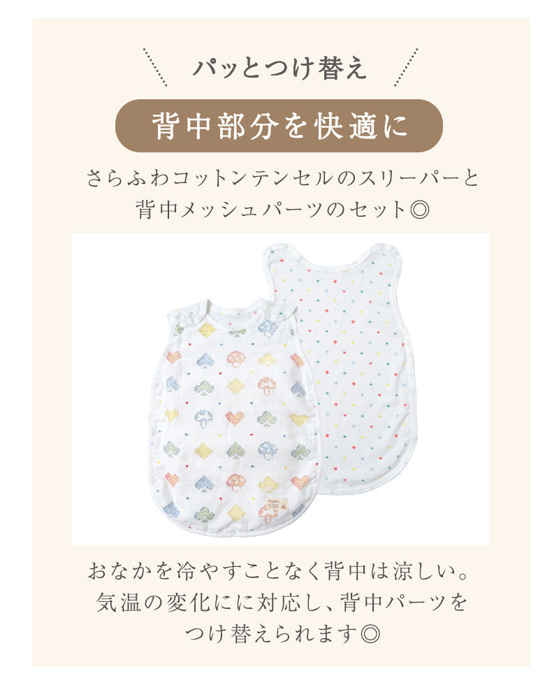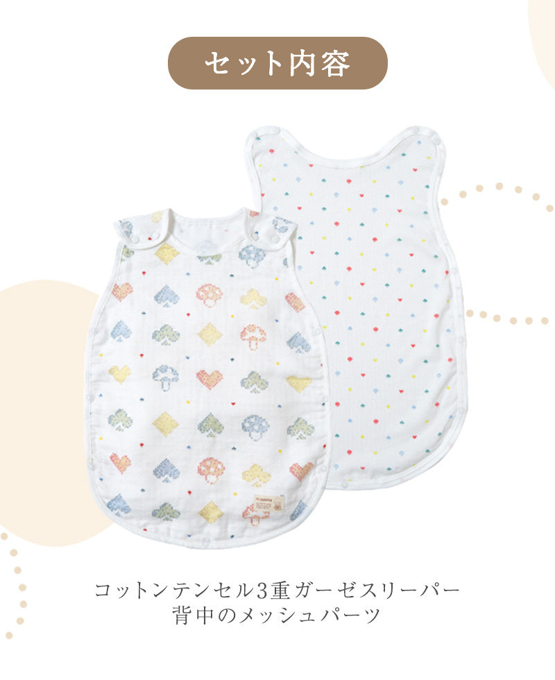 | 【3重ガーゼスリーパー】 ・寝冷え防止、お風呂上がりの湯冷め防止に。 ・出産祝い、誕生日ギフトにもおすすめ。 【メッシュパーツ】 ・寝苦しい夜やあせも対策に。 |
