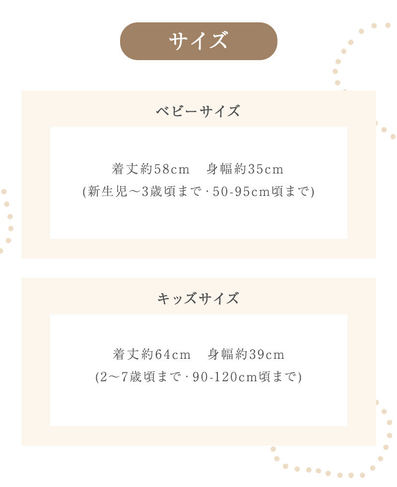 | ・着丈約58cm / 身幅約35cm(新生児~3歳頃 50-95cm) ・着丈約64cm / 身幅約39cm(2~7歳頃 90-120cm) |