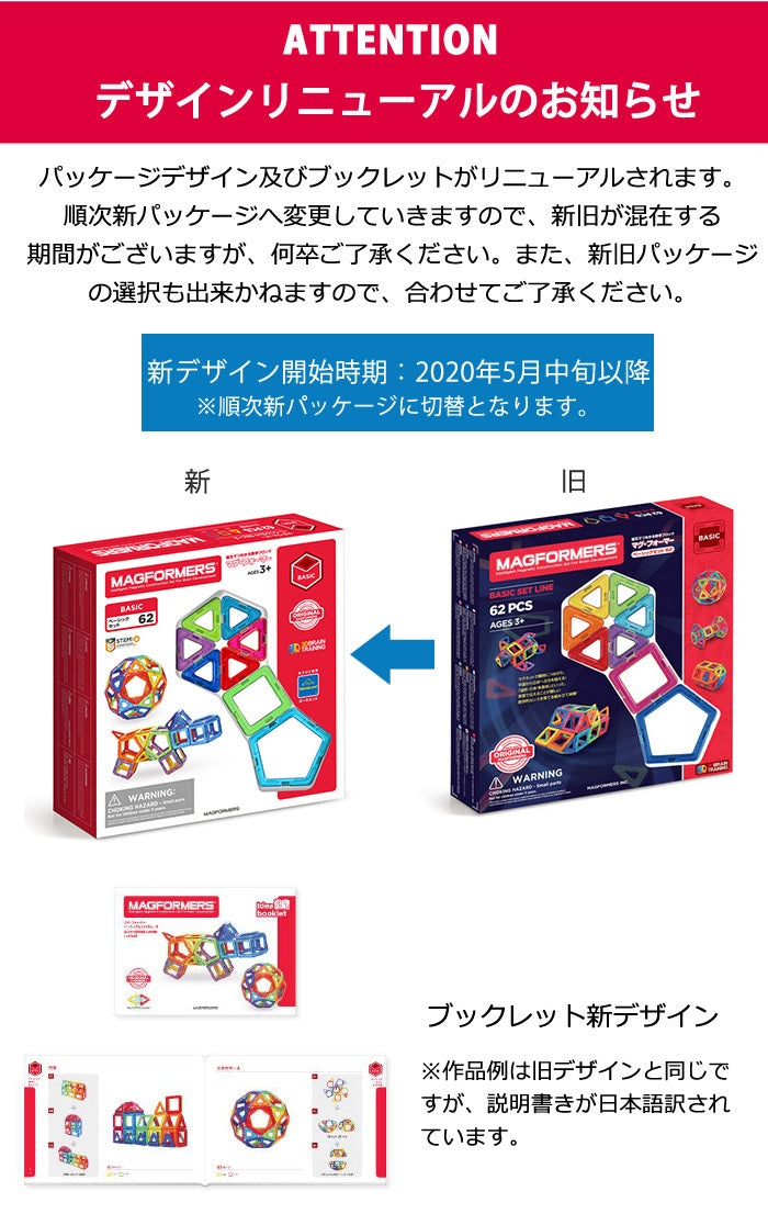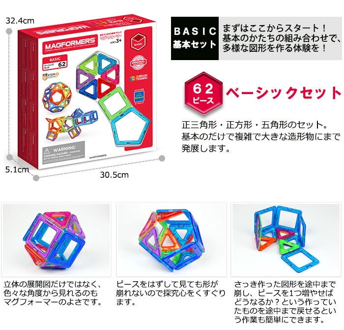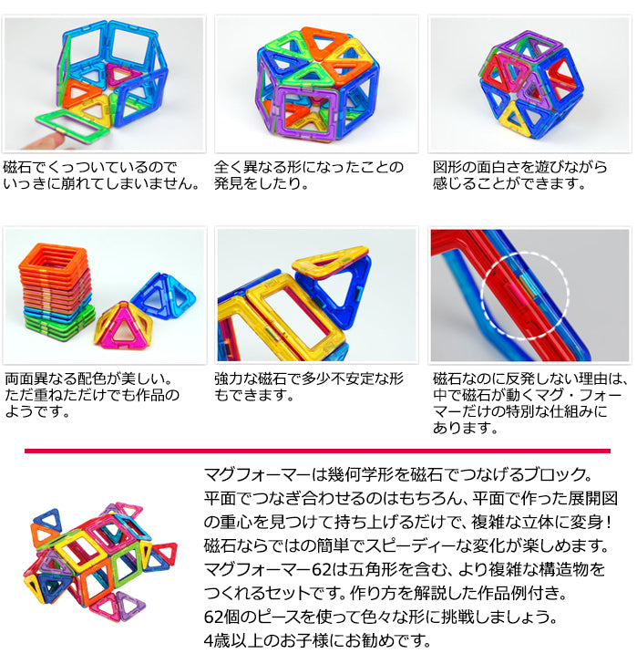 マグフォーマーは幾何学形を磁石でつなげるブロック。平面でつなぎ合わせるのはもちろん、平面で作った展開図の重心を見つけて持ち上げるだけで、複雑な立体に変身!磁石ならではの簡単でスピーディーな変化が楽しめます。正三角形と正方形のみの、遊びやすいセット。磁力を操り簡単な造形遊びが楽しめます。 |
