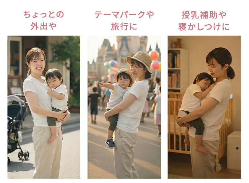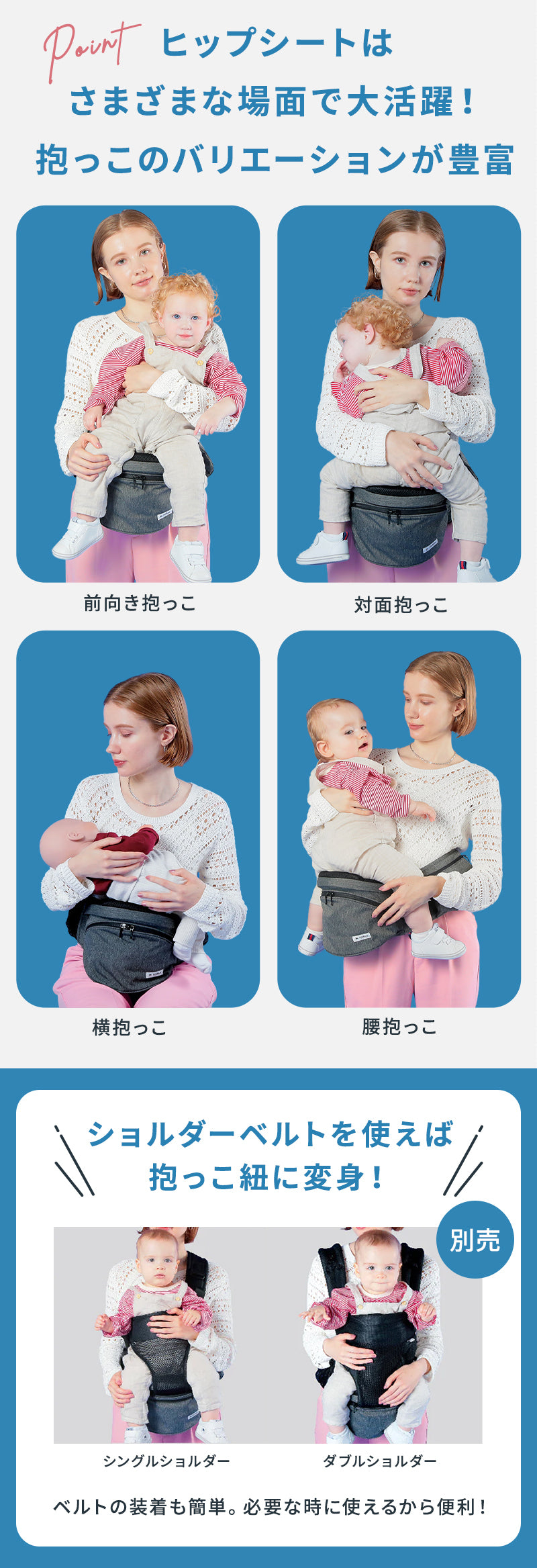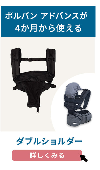| 腰がすわってから(7ヵ月頃)~36ヵ月(体重約15kg)まで 別売りのダブルショルダーを使うと首がすわってから(4ヵ月頃)お使いいただけます。 |