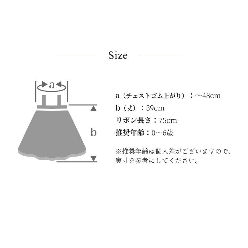 チェストゴム上がり:~48cm 丈:39cm リボン長さ:75cm 推奨年齢0~6歳 |