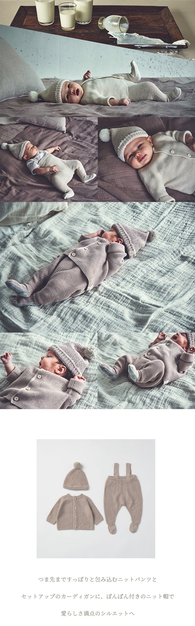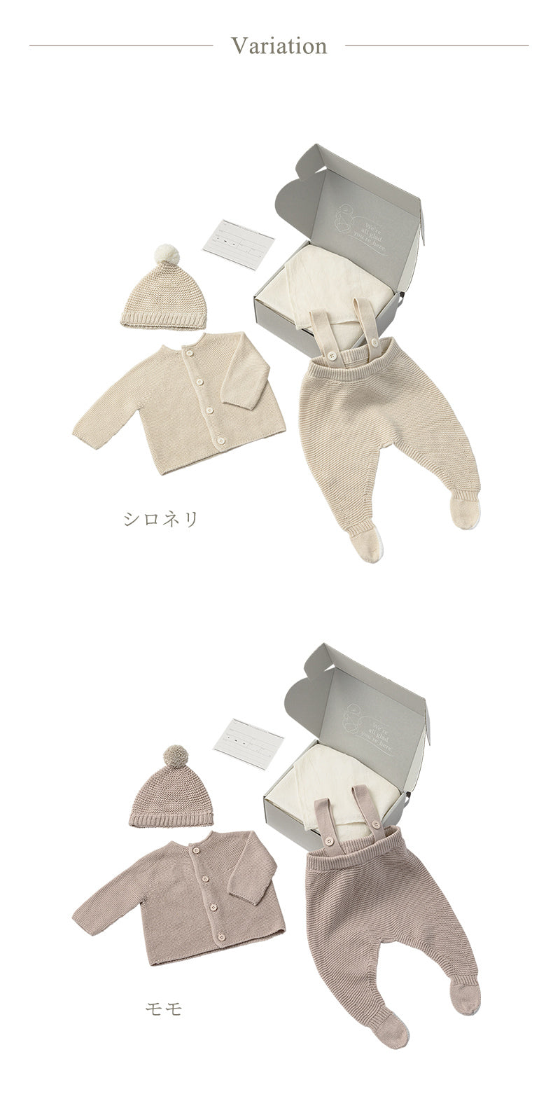 | カーディガン・ニットパンツ:綿100% 帽子本体:綿100% 梵天:アクリル60%、羊毛40% |