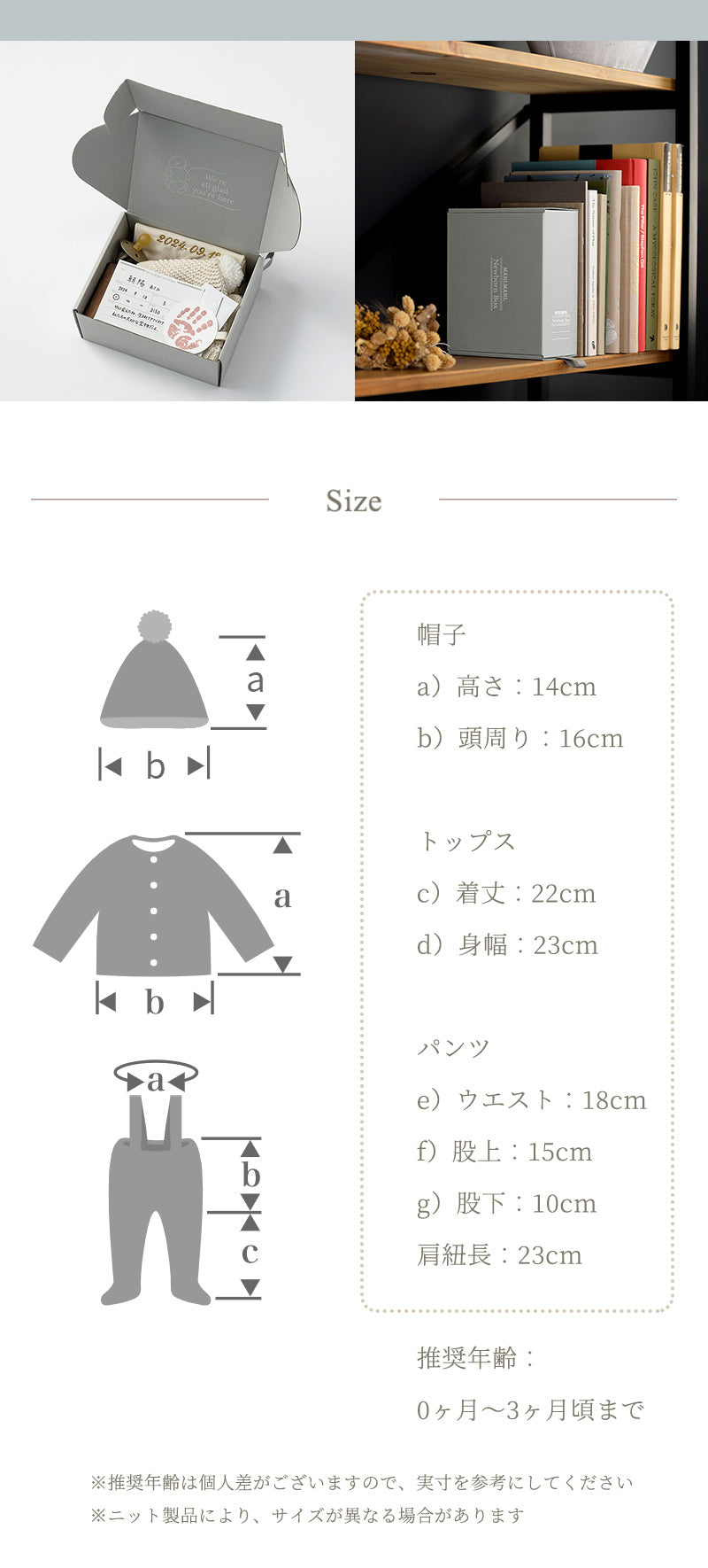 | 帽子 高さ:14cm 頭周り:16cm トップス 着丈:22cm 身幅:23cm パンツ ウエスト:18cm 股上:15cm 股下:10cm 肩紐長:23cm 推奨年齢 0ヶ月から3ヶ月頃まで |